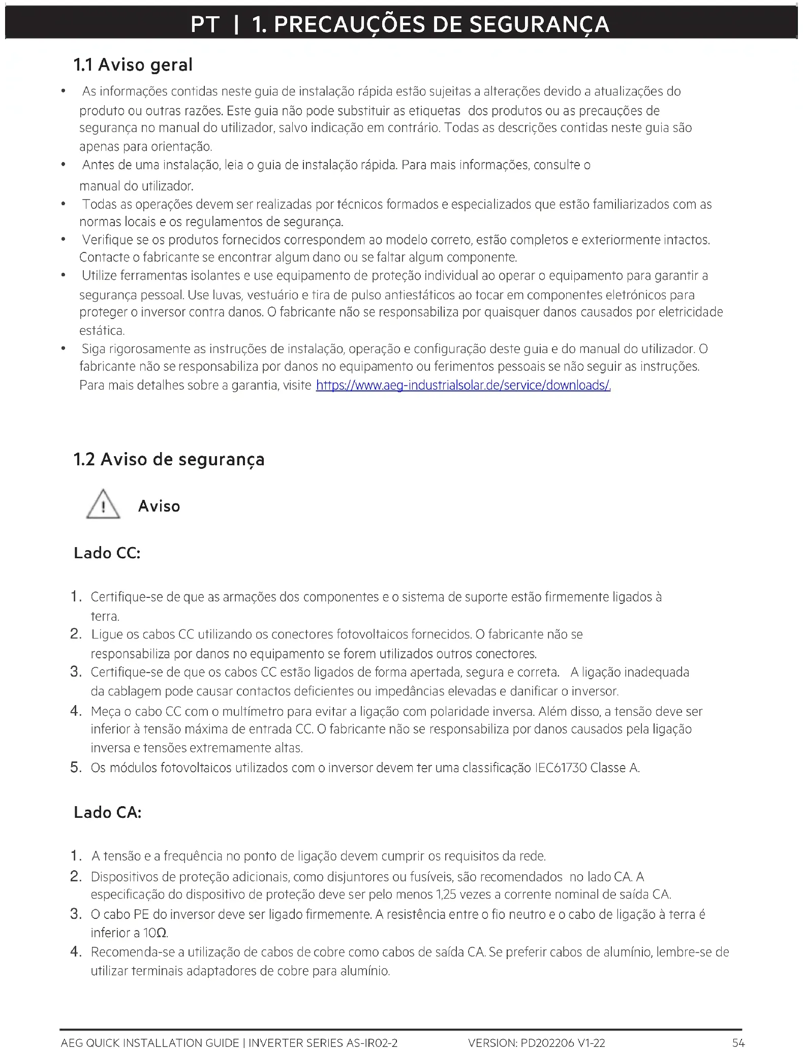 - Siga rigorosamente as instruções de instalação, operação e configuração deste guia e do manual do utilizador. O fabricante não se responsabiliza por danos no equipamento ou ferimentos pessoais se não seguir as instruções. Para mais detalhes sobre a garantia, visite https://www.aeg-industrialsolar.de/service/downloads/.