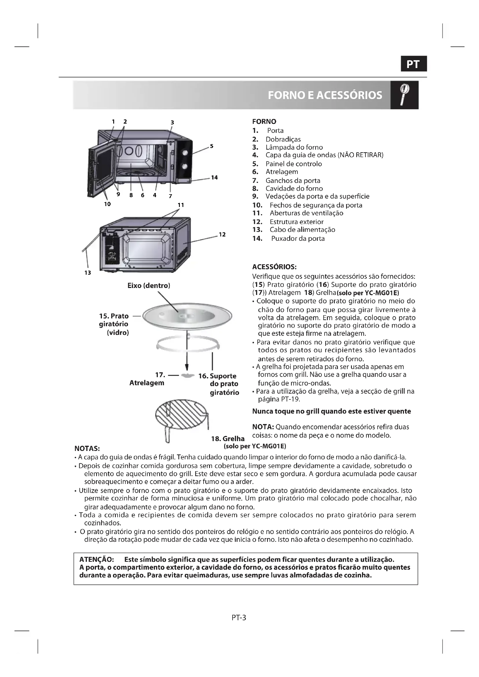Se quiser eliminar este produto, contacte as entidades locais e informe-se sobre o método correcto para proceder à sua eliminação. Atenção: O seu produto está identificado com este símbolo. Significa que os produtos eléctricos e electrónicos não devem ser misturados com o lixo doméstico comum. Existe um sistema de recolhas específico para estes produtos. PT-1 PT-1PT-2 INFORMAÇÃO SOBRE UMA ELIMINAÇÃO ADEQUADA .......................................................................................................1 CONTEÚDOS .......................................................................................................................................................................................2 ESPECIFICAÇÕES ................................................................................................................................................................................2 FORNO E ACESSÓRIOS .....................................................................................................................................................................3 PAINEL DE CONTROLO ....................................................................................................................................................................4 INSTRUÇÕES DE SEGURANÇA IMPORTANTES ....................................................................................................................5-17 INSTALAÇÃO ......................................................................................................................................................................................17 NÍVEIS DE POTÊNCIA DO MICROONDAS ..................................................................................................................................18 COZINHAR COM O MICROONDAS .............................................................................................................................................18 GUIA DE DESCONGELAR ................................................................................................................................................................19 LOIÇA PRÓPRIA PARA O FORNO .................................................................................................................................................19 MANUTENÇÃO E LIMPEZA ........................................................................................................................................................... 0 CONTACTOS DA ASSISTÊNCIA TÉCNICA .................................................................................................................................... I ESPECIFICAÇÕES CONTEÚDOS Nome do modelo: :$.(&4 Tensão da Linha ACFusível de linha de distribuição/disjuntor:Potência AC requerida: MicroondasPotência de saída: Microondas(SJMM.PEP%FTMJHBEPFrequência do MicroondasDimensões Exteriores (C) x (P) x (A) mmDimensões da Cavidade (C) x (P) x (A)** mmCapacidade do FornoPrato giratórioLarguraLâmpada do forno* Este Produto cumpre os requisitos do padrão europeu EN55011.Em conformidade com este padrão, este produto é classi cado como sendo um equipamento de grupo 2 classe B.O grupo 2 signi ca que o equipamento gera intencionalmente energia de rádio-frequência sob a forma de radia-ção eletromagnética para tratamento de aquecimento de alimentos.Equipamento de classe B signi ca que o equipamento é adequado para ser usado em ambientes domésticos.** A capacidade interna calcula-se medindo a largura, profundidade e altura máximas. A capacidade real para os alimentos é menor.COMO PARTE DA POLÍTICA DE CONTÍNUAS MELHORIAS, RESERVAMO-NOS O DIREITO DE ALTERAR O DESENHO E AS ESPECIFICAÇÕES SEM AVISO PRÉVIO.: 230 V, 50 Hz monofásico: 10 A: 1270 W: 800 W (IEC 60705) : W NFOPTEF8: 2450 MHz* (Groupo 2/Classe B): YY: YY: 20 litros**: ø 255 mm : aprox. kg : 25 W <0,5W COZINHAR COM GRILL/COZINHAR COM MIX GRILL (solo per YC-MG01E).....................................................................19 LOIÇA PRÓPRIA PARA O FORNO....................................................................................................................................................20 MANUTENÇÃO E LIMPEZA...............................................................................................................................................................21 440 x 324 x 258306 x 304 x 205aprox. 11.6 kgNome do modelo YC-MS01E YC-MG01ETensão da Linha AC 230 V, 50 Hz monofásicoFusível de linha de distribuição/disjuntor: 10 A 10 A Potência AC requerida: Microondas 1270 W 1270 W Potência de saída: Microondas 800 W (IEC 60705) 800 W (IEC 60705) Grill 1000 WModo Desligado menos de < 0,5W menos de < 0,5W Frequência do Microondas 2450 MHz* (Groupo 2/Classe B) 2450 MHz* (Groupo 2/Classe B) Dimensões Exteriores (C) x (P) x (A) mm 440 x 344 x 258 440 x 344 x 258 Dimensões da Cavidade (C) x (P) x (A)** mm 306 x 304 x 205 306 x 304 x 205 Capacidade do Forno 20 litros** 20 litros**Prato giratório ø 255 mm ø 255 mmLargura aprox. 11,0 kg aprox. 11,6 kgLâmpada do forno 25 W 25 W PT-2 PT-2PT PT-3 PORTUGUÊS '03/0&"$&44»3*04 '03/0 Porta Dobradiças Lâmpada do forno Capa da guia de ondas (NÃO RETIRAR) Painel de controlo Atrelagem Ganchos da porta Cavidade do forno Vedações da porta e da superfície Fechos de segurança da porta Aberturas de ventilação Estrutura exterior Cabo de alimentação Puxador da porta&JYPEFOUSP1SBUPHJSBUØSJPWJESP