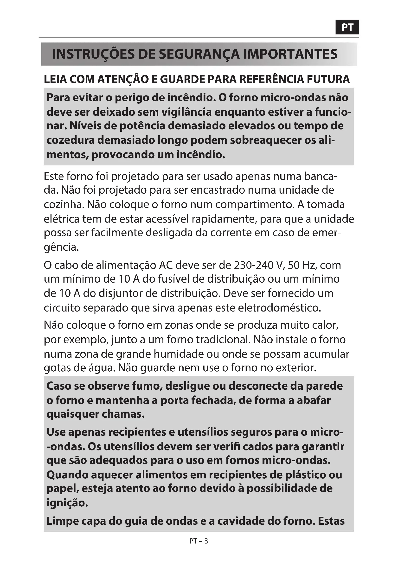 LEIA COM ATENÇÃO E GUARDE PARA REFERÊNCIA FUTURA Para evitar o perigo de incêndio. O forno micro-ondas não deve ser deixado sem vigilância enquanto estiver a funcio- nar. Níveis de potência demasiado elevados ou tempo de cozedura demasiado longo podem sobreaquecer os ali- mentos, provocando um incêndio. Este forno foi projetado para ser usado apenas numa banca- da. Não foi projetado para ser encastrado numa unidade de cozinha. Não coloque o forno num compartimento. A tomada elétrica tem de estar acessível rapidamente, para que a unidade possa ser facilmente desligada da corrente em caso de emer- gência. O cabo de alimentação AC deve ser de 230-240 V, 50 Hz, com um mínimo de 10 A do fusível de distribuição ou um mínimo de 10 A do disjuntor de distribuição. Deve ser fornecido um circuito separado que sirva apenas este eletrodoméstico. Não coloque o forno em zonas onde se produza muito calor, por exemplo, junto a um forno tradicional. Não instale o forno numa zona de grande humidade ou onde se possam acumular gotas de água. Não guarde nem use o forno no exterior. Caso se observe fumo, desligue ou desconecte da parede o forno e mantenha a porta fechada, de forma a abafar quaisquer chamas. Use apenas recipientes e utensílios seguros para o micro- -ondas. Os utensílios devem ser veri cados para garantir que são adequados para o uso em fornos micro-ondas. Quando aquecer alimentos em recipientes de plástico ou papel, esteja atento ao forno devido à possibilidade de ignição. Limpe capa do guia de ondas e a cavidade do forno. EstasPT – 4 PT – 4 devem estar secas e sem gordura. A gordura acumulada pode provocar sobreaquecimento e deitar fumo ou pegar fogo. Não coloque materiais in amáveis perto do forno ou das aber- turas de ventilação. Não bloqueie as aberturas de ventilação. Remova todos os selos metálicos, arames de fechar, etc., dos ali- mentos e embalagens de alimentos. O arco elétrico em super- fícies metálicas pode provocar um incêndio. Não use o micro- -ondas para aquecer óleo para fritar. A temperatura não pode ser controlada e o óleo pode pegar fogo. Para fazer pipocas use apenas pipocas próprias para fazer no micro-ondas. Não guarde comida ou quaisquer outros objetos dentro do forno. Veri que as de nições quando iniciar o forno para ter a certeza que o forno está a funcionar como desejado. Não deixe o forno sem supervisão enquanto estiver a funcionar. Para evitar sobreaquecimento e fogo é necessário ter cuidado especial ao cozinhar ou reaquecer alimentos com muito açúcar ou teor de gordura, por exemplo, salsichas, tartes ou pudins. Veja as dicas correspondentes no manual de utilização. Para evitar o risco de lesões. ATENÇÃO: Não use o forno caso este esteja dani cado ou a funcionar mal. Veri que o seguinte antes de o usar: a) Certi que-se de que a porta se fecha devidamente e que não está desalinhada ou deformada. b) Veri que que as dobradiças e os fechos de segurança da porta não estão partidos ou soltos. c) Veja-se de que as vedações da porta e da superfície não foram dani cadas. d) Certi que-se de que no interior da cavidade do forno ou a porta não há brechas.PT PT – 5 PT – 5 e) Certi que-se de que o cabo de alimentação e a tomada não estão dani cados. Caso a porta ou as vedações da porta estejam dani cadas, o forno não deve ser posto em funcionamento até ter sido repa- rado por uma pessoa competente. Nunca ajuste, repare ou modi que o forno sozinho. É arriscado para qualquer pessoa que não seja uma pessoa competente para tal levar a cabo qualquer tipo de opera- ção que envolva a remoção de uma capa que protege da exposição a energia das micro-ondas. Não opere o forno com a porta aberta nem altere os fechos de segurança da porta de nenhum modo. Não opere o forno se houver algum objeto entre as vedações da porta e as vedações da superfície. Não permita que se acumule gordura ou sujidade nas vedações da porta e nas peças adjacentes. Limpe o forno regularmente e remova todos os depósitos de comida. Siga as instruções em "Limpeza e Cuidados". A falta de lim- peza do forno leva à deterioração da superfície que afe- tará adversamente a vida útil da máquina e poderá criar situações perigosas Pessoas com PACEMAKERS devem aconselhar-se com o seu mé- dico ou com o fabricante do pacemaker sobre regras de segu- rança com fornos micro-ondas. Para evitar a possibilidade de choques elétricos