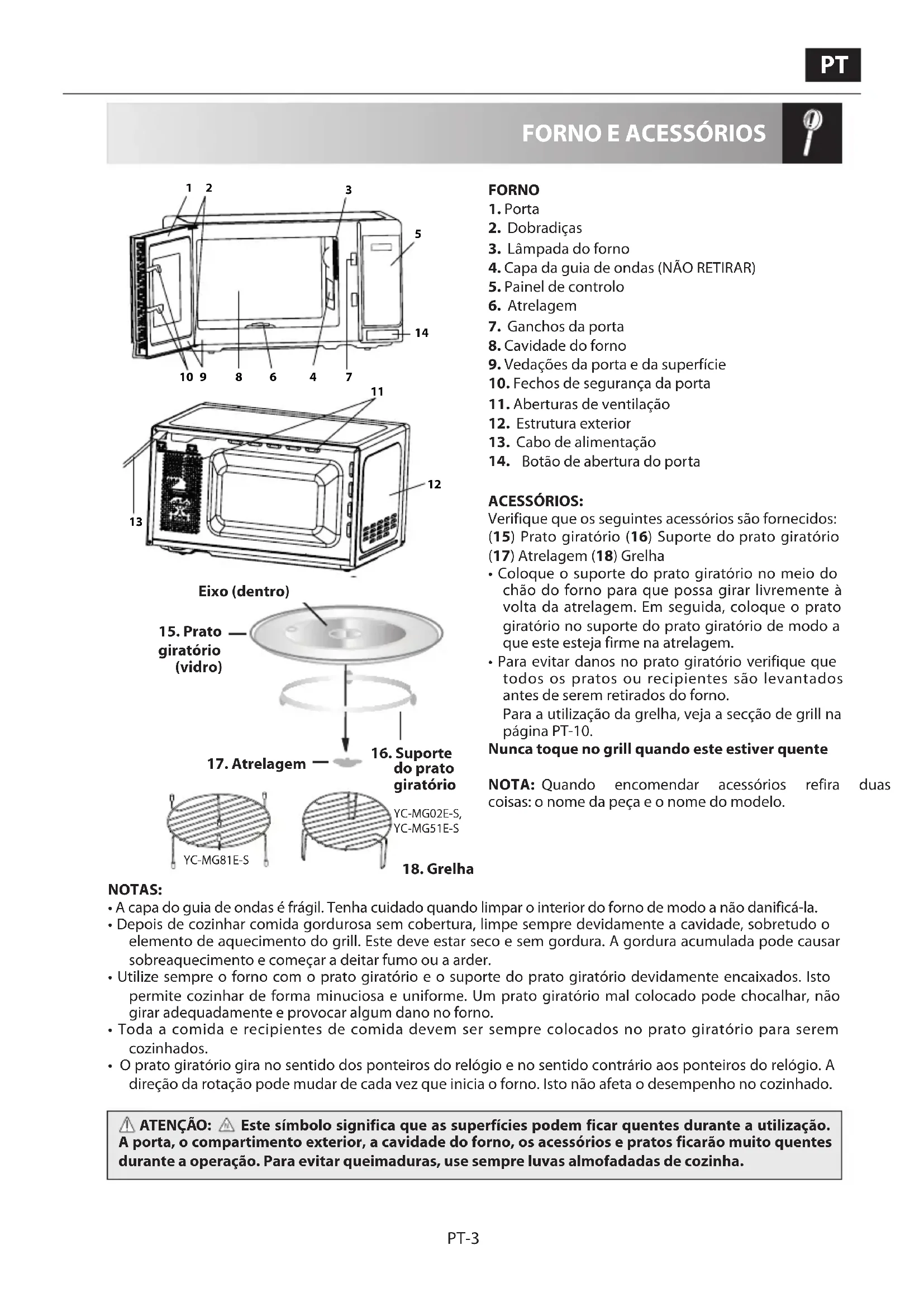 - Este Produto cumpre os requisitos do padrão europeu EN55011. Em conformidade com este padrão, este produto é classi cado como sendo um equipamento de grupo 2 classe B. O grupo 2 signi ca que o equipamento gera intencionalmente energia de rádio-frequência sob a forma de radia- ção eletromagnética para tratamento de aquecimento de alimentos. Equipamento de classe B signi ca que o equipamento é adequado para ser usado em ambientes domésticos. ** A capacidade interna calcula-se medindo a largura, profundidade e altura máximas. A capacidade real para os alimentos é menor. COMO PARTE DA POLÍTICA DE CONTÍNUAS MELHORIAS, RESERVAMO-NOS O DIREITO DE ALTERAR O DESENHO E AS ESPECIFICAÇÕES SEM AVISO PRÉVIO. PT-2PT-2 Nome do modelo: YC-MG02E-S YC-MG51E-S YC-MG81E-S Tensão da Linha AC: 230 V, 50 Hz monofásico : 230 V, 50 Hz monofásico : 230 V, 50 Hz monofásico Fusível de linha de distribuição/disjuntor : 10 A : 10 A : 10 A Potência AC requerida: Microondas : 1270 W : 1450 W : 1450 W Potência de saída: Microondas : 800 W : 900 W : 900 W Grill : 1000 W : 1000 W : 1100 W Modo de esp era: < 1,0W : < 1,0W : < 1,0W Modo Poupança de Energia : < 0,5W : < 0,5W : < 0,5W Frequência do Microondas : 2450 MHz*: 2450 MHz*: 2450 MHz* Dimensões Exteriores (L) x (A) x (P) mm : 440 x 258 x 324 : 513x 306 x 394 : 512 x 300 x 396 Dim ensões Exteriores (L) x (A) x (P)** mm : 306 x 205 x 304 : 328 x 206 x 368: 348 x 226 x 356 Capacidade do Forno : 20 litros** : 25 litros** : 28 litros** Prato giratório : ø 255 mm : ø 315 mm : ø 315 mm Largura: aprox. 11,5 kg: aprox. 15,4 kg: aprox. 15,8 kg Lâmpada do forno : 25 W : 25 W : 25 WPT PT-3 PORTUGUÊS