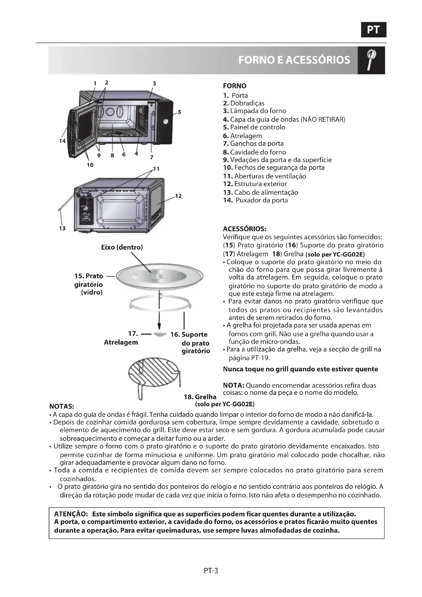- Para evitar danos no prato giratório verifique que todos os pratos ou recipientes são levantados antes de serem retirados do forno.• A grelha foi projetada para ser usada apenas em fornos com grill. Não use a grelha quando usar a função de micro-ondas.• Para a utilização da grelha, veja a secção de grill na página PT-19. Nunca toque no grill quando este estiver quenteNOTA: Quando encomendar acessórios refira duascoisas: o nome da peça e o nome do modelo.18. Grelha (solo per YC-GG02E) (solo per YC-GG02E)