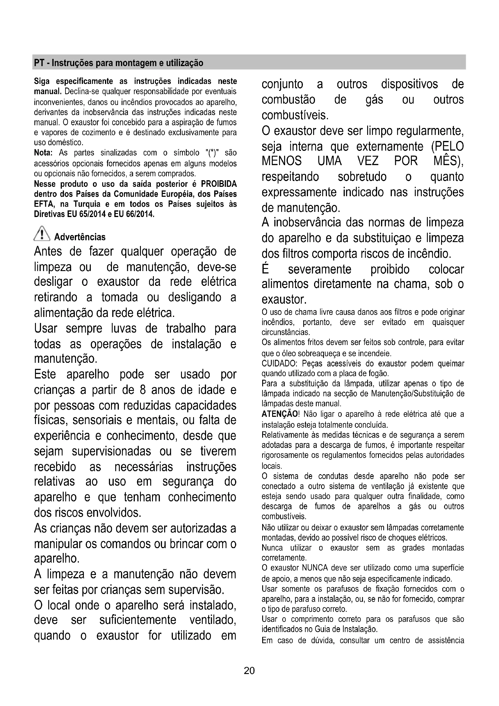 PRODUCTOS QUE CONTENGAN CLORO! Filtro antigrasa Retiene las partículas de grasa producidas cuando se cocina. Si està situado en el interior de una parilla de soporte, puede ser uno de los siguientes tipos: El filtro de papel tiene que ser substituido una vez al mes o si està coloreado en el lado superior, cuando el color transluce por los orificios de la parilla. El filtro metàlico tiene que ser limpiado una vez al mes, con detergentes no agresivos, manualmente o en el lavavajillas a temperaturas bajas y con un ciclo de lavado breve. Con el lavado en el lavavajilla el filtro antigrasa metálico puede desteñirse pero sus características de filtrado no cambian absolutamente. Para acceder al filtro grasas abra la rejilla con los enganches P y sáquelo de los topes R1 y R 2. El filtro metálico autoportante no tiene rejilla para sujetarlo, para sacarlo tire de los muelles de desenganche P4 hacia atrás y saque el filtro hacia abajo. Filtro al carbón activo (solamente para la versión filtrante) Retiene los olores desagradables producidos por la cocción de alimentos. La saturaciòn del carbòn activado ocurre despuès da mas o menos tiempo de uso prolongado, dependiendo del tipo de cocina y de la regularidad de limpieza del filtro de grasa. En cualquier caso es necesario sustituir el cartucho al menos cada 4 meses. NO puede lavarse o reciclarse. Puede ser de diferentes tipos: Rectangular S1 o S2 o S3: Montaje (S1 o S2): introduzca la parte posterior T y engánchela anteriormente (U). Montaje (S3): Quite la tapa W girando 90° los pomos O. Introduzca la esponja de carbón en su sitio y sujétela girando 90° el pomo O, vuelva a cerrar la tapa. Realice esta operación al revés para desmontarla. Circular (V1-V2-V3- varios modelos): Encaje a bayoneta Situar en el centro tapando la rejilla que protege el motor teniendo cuidado de que las referencias X1 X2 X3 en el filtro al carbón correspondan con las referencias Y1 o Y2 en el canalizador, gíre despuès en sentido de las agujas del reloj, si posee una lengueta Z acuérdese de levantarla antes un poco. Sustitución de la lámpara Desconecte el aparato de la red elèctrica. Atención! Antes de tocar las lámparas asegúrese de que esten frías. Sustituir la lámpara dañada con una del mismo tipo como se especifica en la etiqueta correspondiente o en la campana cerca de la lámpara misma . Substituciòn làmparas 28W - Desatornille la lámpara dañada y cámbiela con una lámpara oval halógenas Max 28W E14. Quite la rejilla para acceder al lugar donde se encuentran las lámparas. Substituciòn làmparas halógenas - Extraer la protección haciendo palanca con un pequeño destornillador de boca plana o una herramienta similar. Sustituir la lámpara dañada. Utilizar sólo lámparas halógenas de 20W máx (G4) prestando atención en no tocarlas con las manos. Cerrar el plafón (fijación a presión). Si la iluminación no funciona, antes de llamar al servicio de asistencia técnica, revisar que las lámparas estén correctamente instaladas.20 PT - Instruções para montagem e utilização Siga especificamente as instruções indicadas neste manual. Declina-se qualquer responsabilidade por eventuais inconvenientes, danos ou incêndios provocados ao aparelho, derivantes da inobservância das instruções indicadas neste manual. O exaustor foi concebido para a aspiração de fumos e vapores de cozimento e é destinado exclusivamente para uso doméstico. Nota: As partes sinalizadas com o símbolo "(*)" são acessórios opcionais fornecidos apenas em alguns modelos ou opcionais não fornecidos, a serem comprados. Nesse produto o uso da saída posterior é PROIBIDA dentro dos Países da Comunidade Européia, dos Países EFTA, na Turquia e em todos os Países sujeitos às Diretivas EU 65/2014 e EU 66/2014. Advertências Antes de fazer qualquer operação de limpeza ou de manutenção, deve-se desligar o exaustor da rede elétrica retirando a tomada ou desligando a alimentação da rede elétrica. Usar sempre luvas de trabalho para todas as operações de instalação e manutenção. Este aparelho pode ser usado por crianças a partir de 8 anos de idade e por pessoas com reduzidas capacidades físicas, sensoriais e mentais, ou falta de experiência e conhecimento, desde que sejam supervisionadas ou se tiverem recebido as necessárias instruções relativas ao uso em segurança do aparelho e que tenham conhecimento dos riscos envolvidos. As crianças não devem ser autorizadas a manipular os comandos ou brincar com o aparelho. A limpeza e a manutenção não devem ser feitas por crianças sem supervisão. O local onde o aparelho será instalado, deve ser suficientemente ventilado, quando o exaustor for utilizado em conjunto a outros dispositivos de combustão de gás ou outros combustíveis. O exaustor deve ser limpo regularmente, seja interna que externamente (PELO MENOS UMA VEZ POR MÊS), respeitando sobretudo o quanto expressamente indicado nas instruções de manutenção. A inobservância das normas de limpeza do aparelho e da substituiçao e limpeza dos filtros comporta riscos de incêndio. É severamente proibido colocar alimentos diretamente na chama, sob o exaustor. O uso de chama livre causa danos aos filtros e pode originar incêndios, portanto, deve ser evitado em quaisquer circunstâncias. Os alimentos fritos devem ser feitos sob controle, para evitar que o óleo sobreaqueça e se incendeie. CUIDADO: Peças acessíveis do exaustor podem queimar quando utilizado com a placa de fogão. Para a substituição da lâmpada, utilizar apenas o tipo de lâmpada indicado na secção de Manutenção/Substituição de lâmpadas deste manual. ATENÇÃO! Não ligar o aparelho à rede elétrica até que a instalação esteja totalmente concluída. Relativamente às medidas técnicas e de segurança a serem adotadas para a descarga de fumos, é importante respeitar rigorosamente os regulamentos fornecidos pelas autoridades locais. O sistema de conduta