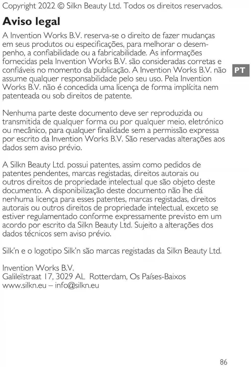 Copyright 2022 © Silkn Beauty Ltd. Todos os direitos reservados. Aviso legal A Invention Works B.V. reserva-se o direito de fazer mudanças em seus produtos ou especificações, para melhorar o desem- penho, a confiabilidade ou a fabricabilidade. As informações fornecidas pela Invention Works B.V. são consideradas corretas e confiáveis no momento da publicação. A Invention Works B.V. não assume qualquer responsabilidade pelo seu uso. Pela Invention Works B.V. não é concedida uma licença de forma implícita nem patenteada ou sob direitos de patente. Nenhuma parte deste documento deve ser reproduzida ou transmitida de qualquer forma ou por qualquer meio, eletrónico ou mecânico, para qualquer finalidade sem a permissão expressa por escrito da Invention Works B.V. São reservadas alterações aos dados sem aviso prévio. A Silkn Beauty Ltd. possui patentes, assim como pedidos de patentes pendentes, marcas registadas, direitos autorais ou outros direitos de propriedade intelectual que são objeto deste documento. A disponibilização deste documento não lhe dá nenhuma licença para esses patentes, marcas registadas, direitos autorais ou outros direitos de propriedade intelectual, exceto se estiver regulamentado conforme expressamente previsto em um acordo por escrito da Silkn Beauty Ltd. Sujeito a alterações dos dados técnicos sem aviso prévio. Silk’n e o logotipo Silk’n são marcas registadas da Silkn Beauty Ltd. Invention Works B.V. Galileïstraat 17, 3029 AL Rotterdam, Os Países-Baixos www.silkn.eu – info@silkn.eu87