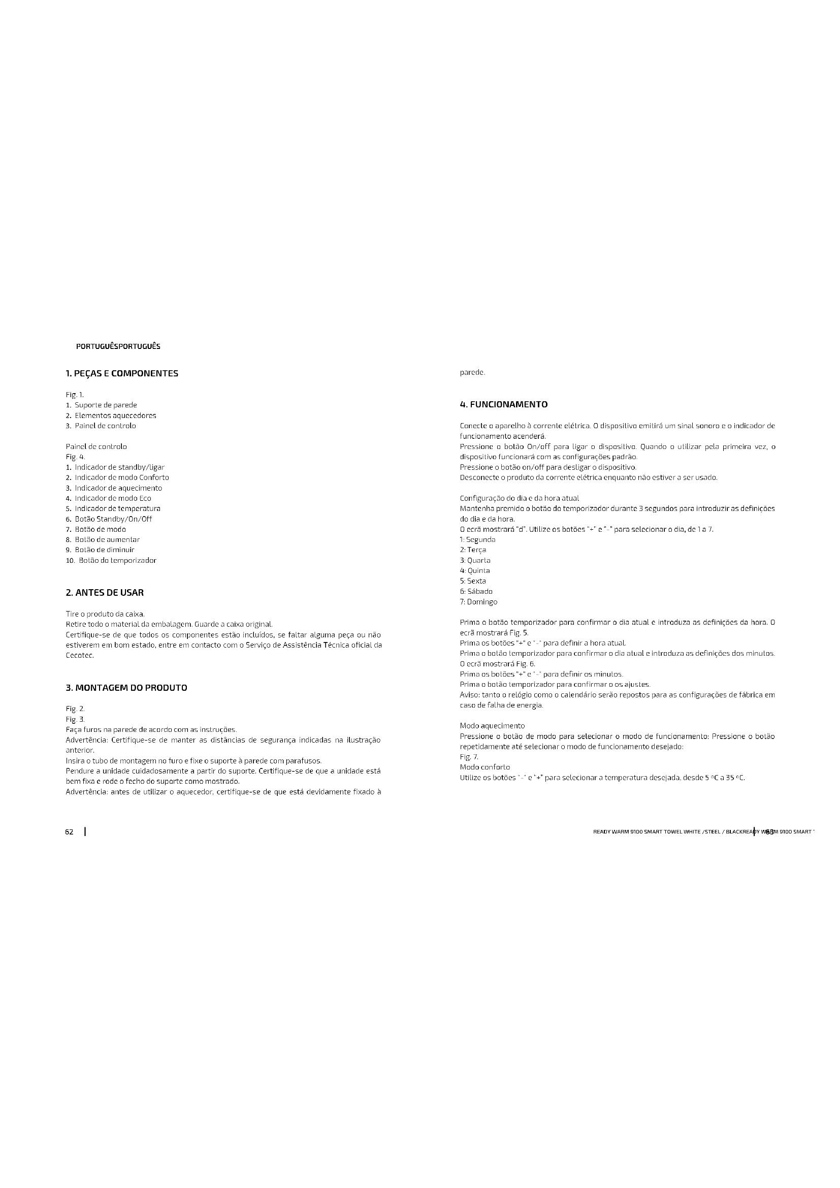 Conecte o aparelho à corrente elétrica. O dispositivo emitirá um sinal sonoro e o indicador de funcionamento acenderá. Pressione o botão On/off para ligar o dispositivo. Quando o utilizar pela primeira vez, o dispositivo funcionará com as configurações padrão. Pressione o botão on/off para desligar o dispositivo. Desconecte o produto da corrente elétrica enquanto não estiver a ser usado. Configuração do dia e da hora atual Mantenha premido o botão do temporizador durante 3 segundos para introduzir as definições do dia e da hora. O ecrã mostrará “d”. Utilize os botões “+” e “-” para selecionar o dia, de 1 a 7. 1: Segunda 2: Terça 3: Quarta 4: Quinta 5: Sexta 6: Sábado 7: Domingo Prima o botão temporizador para confirmar o dia atual e introduza as definições da hora. O ecrã mostrará Fig. 5. Prima os botões "+" e "-" para definir a hora atual. Prima o botão temporizador para confirmar o dia atual e introduza as definições dos minutos. O ecrã mostrará Fig. 6. Prima os botões "+" e "-" para definir os minutos. Prima o botão temporizador para confirmar o os ajustes. Aviso: tanto o relógio como o calendário serão repostos para as configurações de fábrica em caso de falha de energia. Modo aquecimento Pressione o botão de modo para selecionar o modo de funcionamento: Pressione o botão repetidamente até selecionar o modo de funcionamento desejado: Fig. 7. Modo conforto Utilize os botões “-“ e “+” para selecionar a temperatura desejada, desde 5 ºC a 35 ºC.READY WARM 9100 SMART TOWEL WHITE /STEEL / BLACKREADY WARM 9100 SMART TOWEL WHITE /STEEL / BLACK