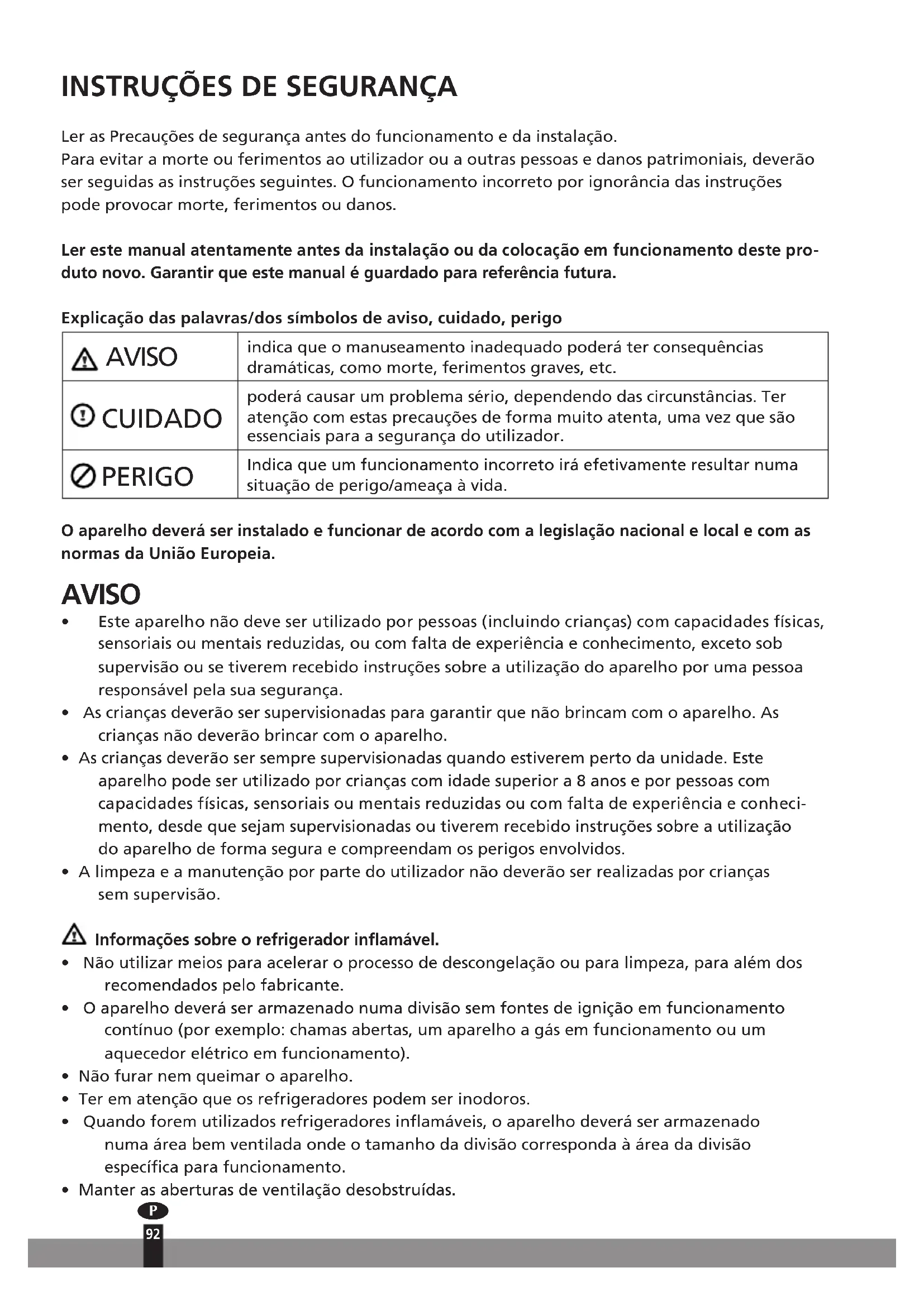 - A limpeza e a manutenção por parte do utilizador não deverão ser realizadas por crianças sem supervisão. Informações sobre o refrigerador inamável.