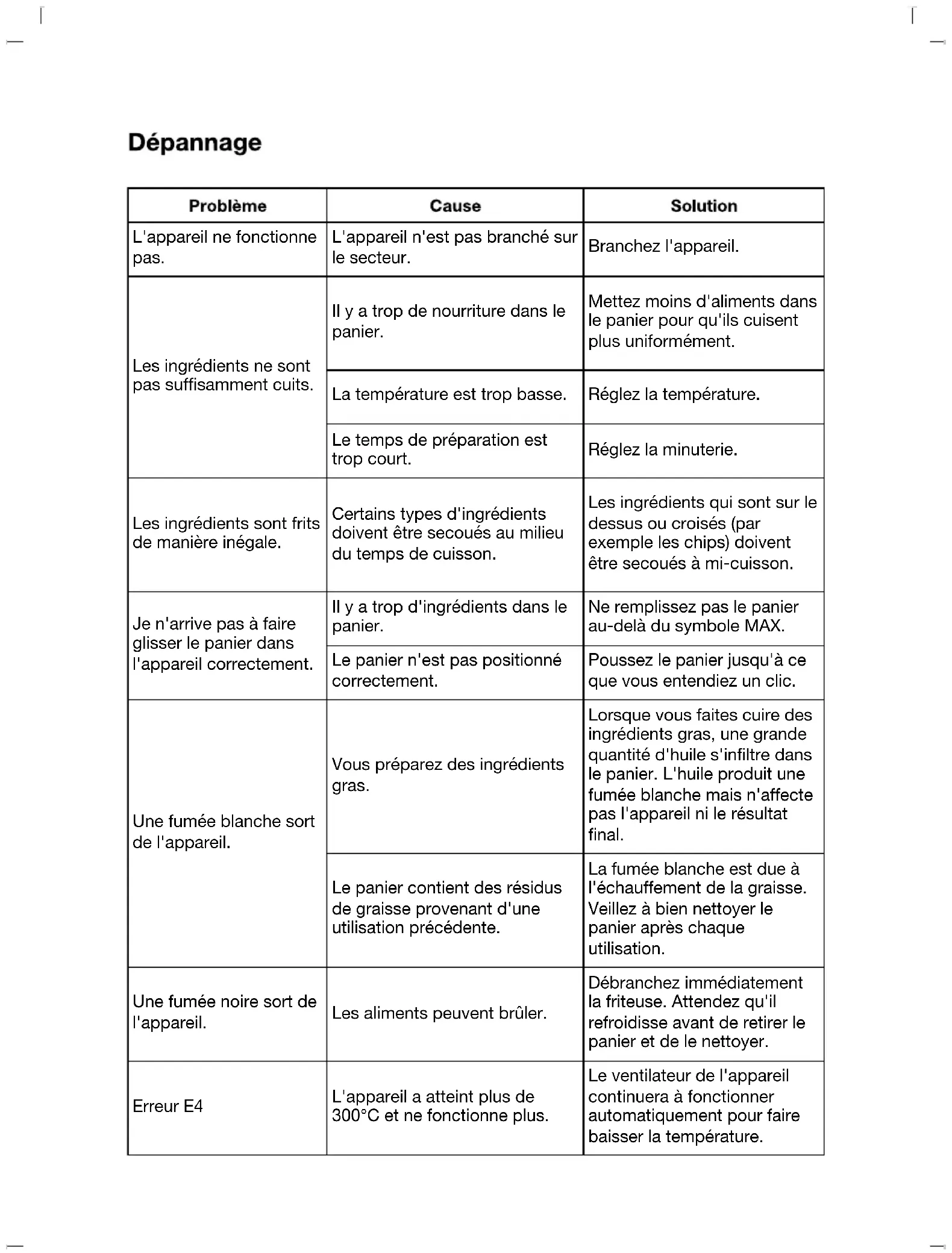NOTA: Adicionar 3 minutos a todos os menus se o aparelho estiver frio no início da cozedura. Não armazenar a fritadeira quando está quente ou húmida. O cesto e o suporte interior são laváveis na máquina de lavar louça.O aparelho não funciona. O aparelho não está ligado à rede eléctrica. Ligar o aparelho. Os ingredientes não são suficientemente cozinhados. Há demasiada comida no cesto. Colocar menos comida no cesto para que cozinhe de forma mais uniforme. A temperatura é demasiado baixa. Ajustar a temperatura. O tempo de preparação é demasiado curto. Definir o temporizador. Os ingredientes são fritos de forma desigual. Certos tipos de ingredientes precisam de ser abanados a meio do tempo de cozedura. Os ingredientes que estão por cima ou cruzados (por exemplo, batatas fritas) devem ser abanados a meio do tempo de cozedura. Não consigo deslizar o cesto para dentro do aparelho correctamente. Há demasiados ingredientes no cesto. Não encher o cesto por cima do símbolo MAX. O cesto não está posicionado correctamente. Empurrar o cesto até ouvir um clique. O fumo branco sai do aparelho. Está a preparar ingredientes gordos. Ao cozinhar ingredientes gordos, uma grande quantidade de óleo irá infiltrar-se no cesto. O óleo produz fumo branco mas não afecta o aparelho nem o resultado final. O cesto contém resíduos de gorduras de utilização anterior. O fumo branco é devido ao aquecimento da gordura. Certifique-se de limpar bem o cesto após cada utilização. O fumo negro sai do aparelho. Os alimentos podem estar a arder. Desligar imediatamente a fritadeira da tomada. Esperar até arrefecer antes de remover o cesto e limpar. Erro E4 O aparelho atingiu mais de 300°C e deixou de funcionar. O ventilador do aparelho continuará a funcionar automaticamente para baixar a temperatura.-