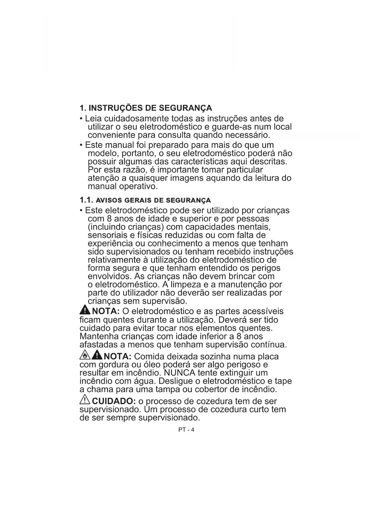 - Este eletrodoméstico pode ser utilizado por crianças com 8 anos de idade e superior e por pessoas (incluindo crianças) com capacidades mentais, sensoriais e físicas reduzidas ou com falta de experiência ou conhecimento a menos que tenham sido supervisionados ou tenham recebido instruções relativamente à utilização do eletrodoméstico de forma segura e que tenham entendido os perigos envolvidos. As crianças não devem brincar com o eletrodoméstico. A limpeza e a manutenção por parte do utilizador não deverão ser realizadas por crianças sem supervisão. NOTA: O eletrodoméstico e as partes acessíveis ficam quentes durante a utilização. Deverá ser tido cuidado para evitar tocar nos elementos quentes. Mantenha crianças com idade inferior a 8 anos afastadas a menos que tenham supervisão contínua. NOTA: Comida deixada sozinha numa placa com gordura ou óleo poderá ser algo perigoso e resultar em incêndio. NUNCA tente extinguir um incêndio com água. Desligue o eletrodoméstico e tape a chama para uma tampa ou cobertor de incêndio. CUIDADO: o processo de cozedura tem de ser supervisionado. Um processo de cozedura curto tem de ser sempre supervisionado.PT - 5 NOTA: Perigo de incêndio: Não coloque itens sobre as superfícies de cozedura. NOTA: Se a superfície estiver rachada, desligue o eletrodoméstico para evitar a possibilidade de choque elétrico.