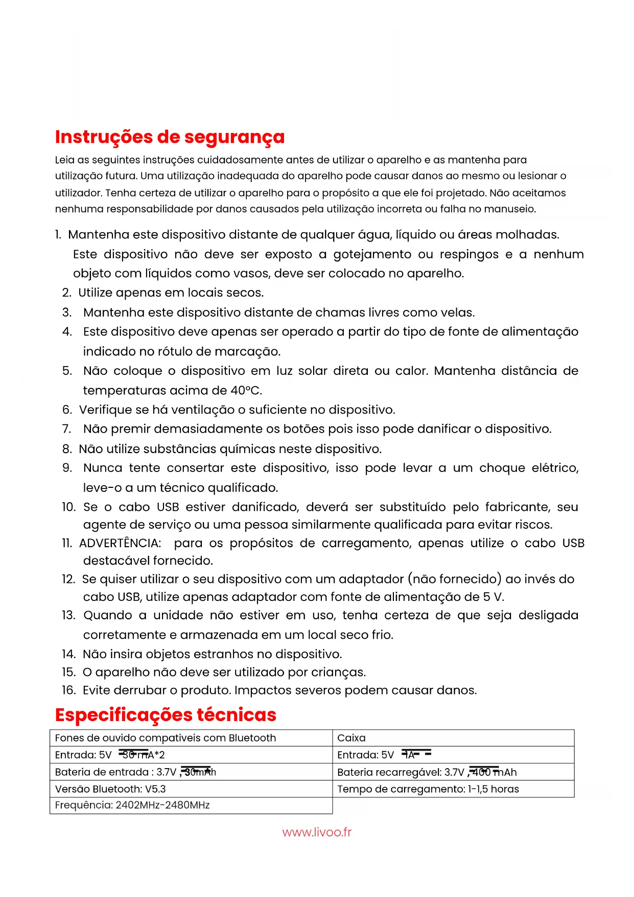 Especificações técnicas Fones de ouvido compativeis com Bluetooth Caixa Entrada: 5V 30 mA*2 Entrada: 5V 1A Bateria de entrada : 3.7V , 30mAh Bateria recarregável: 3.7V , 400 mAh Versão Bluetooth: V5.3 Tempo de carregamento: 1-1,5 horas Frequência: 2402MHz-2480MHzwww.livoo.fr Tempo de carregamento: 1,5 horas