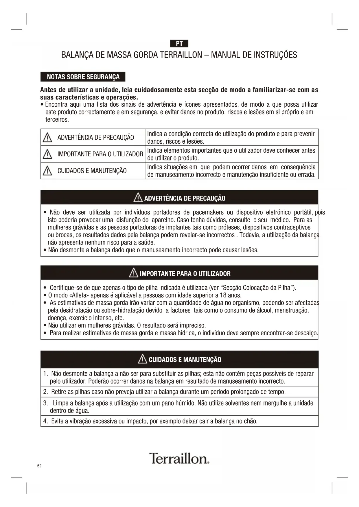 BALANÇA DE MASSA GORDA TERRAILLON – MANUAL DE INSTRUÇÕES Quando devo utilizar as funções de massa gorda e hídrica? Para obter o máximo de precisão e repetibilidade, recomenda-se que as funções de massa gorda e hídrica sejam utilizadas na mesma altura do dia (por exemplo: de manhã, antes do pequeno-almoço) e que sejam evitadas variações do nível de hidratação do corpo antes da medição. Recomendamos que estabeleça o seu próprio valor de referência para a taxa de massa gorda e hídrica e que acompanhe as suas alterações, em vez de comparar apenas os seus valores com o valor normal da população. Qual é a finalidade da função “Taxa Metabólica Basal”? A Taxa Metabólica Basal mostrada na escala representa a energia necessária para satisfazer as necessidades vitais do corpo em repouso. É calculado com base na idade, sexo e gordura corporal. Dependendo da atividade física, um coeficiente deve ser aplicado para determinar as necessidades diárias de calorias. Abaixo estão os coeficientes a serem aplicados: Sedentária (sem atividade ou muito pouco exercício) : MB x 1.2. Ligeiramente ativo (exercício entre 1 e 3 vezes por semana): MB x 1,375. Ativo (atividade física regular (entre 3 e 5 vezes por semana): MB x 1,55. Muito ativo (exercício diário ou esporte sustentado): MB x 1,725. Extremamente ativo (trabalho muito esportivo ou muito físico): MB x 1,9. Por que é necessário o modo Atleta num impedancímetro? O cálculo da massa gorda, efectuado com a ajuda do método BIA, pode fazer uma estimativa por excesso da taxa de massa gorda dos atletas adultos de alto nível. Nos atletas, as variações fisiológicas da densidade óssea e do nível de hidratação são duas das razões apresentadas para justificar a diferença. O modo Atleta só pode ser seleccionado por adultos com idade igual ou superior a 18 anos. Definição de atleta Os investigadores estão de acordo quanto à possibilidade de se utilizar uma dimensão quantitativa na definição de atleta. Por exemplo, um atleta pode ser definido como uma pessoa que treina, no mínimo, três vezes por semana durante duas horas de cada vez para melhorar as competências específicas exigidas na realização do desporto e/ou actividade específica. Sejam recolhidas e recicladas. Não misturar diferentes tipos de pilhas. Não misturar as pilhas usadas com as pilhas novas. No fim da vida útil, depositar este produto num ponto de recolha destinado à reciclagem dos resíduos de equipamentos eléctricos e electrónicos. Este produto está garantido contra qualquer defeito de material e de fabrico. Durante a validade da garantia, tais defeitos serão reparados gratuitamente (em caso de reclamação sob garantia, a prova de compra deverá ser apresentada). Esta garantia não cobre os danos resultantes de acidentes, utilização indevida ou negligência. Em caso de reclamação, contactar em primeiro lugar a loja onde efectuou a compra.