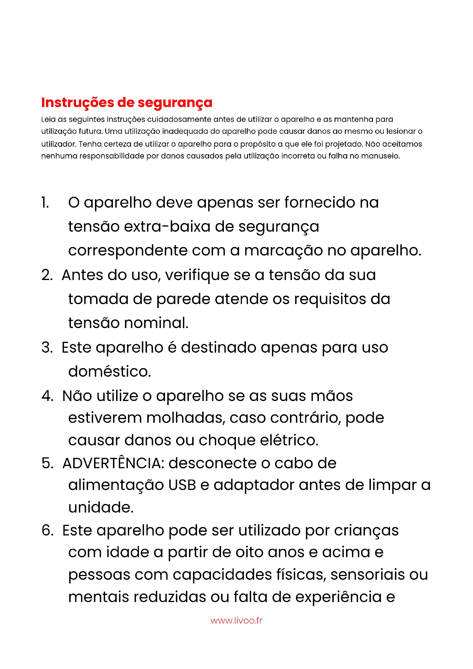 com idade a partir de oito anos e acima e pessoas com capacidades físicas, sensoriais ou mentais reduzidas ou falta de experiência ewww.livoo.fr conhecimento se for dado a elas supervisão ou instrução quanto ao uso do aparelho de uma maneira segura e entendem os riscos envolvidos. As crianças não devem brincar com o aparelho. A limpeza e a manutenção de utilizador não devem ser feitas por crianças sem supervisão.