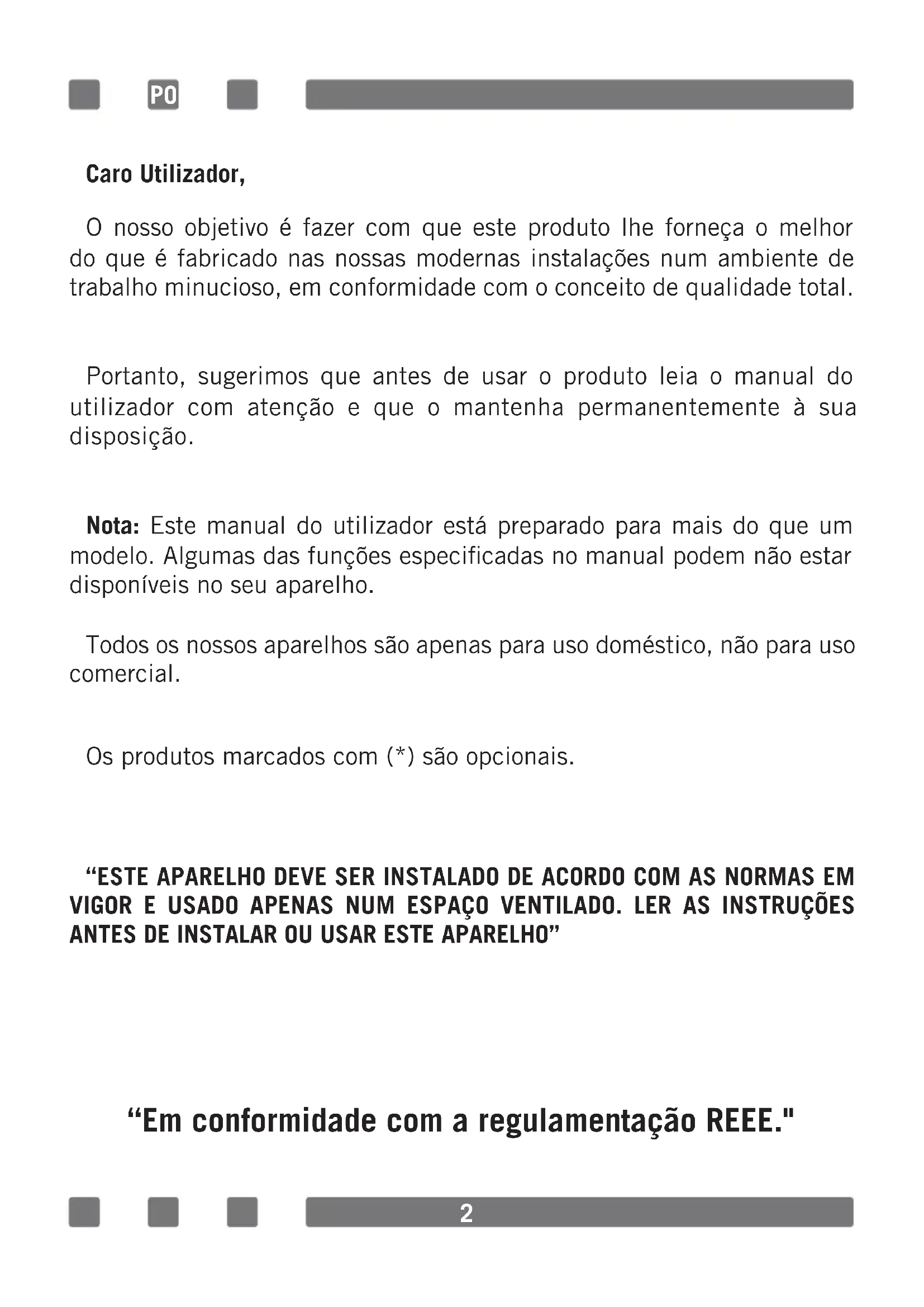 Caro Utilizador, O nosso objetivo é fazer com que este produto lhe forneça o melhor do que é fabricado nas nossas modernas instalações num ambiente de trabalho minucioso, em conformidade com o conceito de qualidade total. Portanto, sugerimos que antes de usar o produto leia o manual do utilizador com atenção e que o mantenha permanentemente à sua disposição. Nota: Este manual do utilizador está preparado para mais do que um modelo. Algumas das funções especicadas no manual podem não estar disponíveis no seu aparelho. Todos os nossos aparelhos são apenas para uso doméstico, não para uso comercial. Os produtos marcados com (*) são opcionais. “ESTE APARELHO DEVE SER INSTALADO DE ACORDO COM AS NORMAS EM VIGOR E USADO APENAS NUM ESPAÇO VENTILADO. LER AS INSTRUÇÕES ANTES DE INSTALAR OU USAR ESTE APARELHO” “Em conformidade com a regulamentação REEE." PO3 Conteúdo Advertências importantes 4 Ligação elétrica 16 Ligação do gás 17 Apresentação do aparelho 22 Acessórios 23 Funções técnicas do seu forno 24 Instalação do seu forno 27 Ilustração da xação da corrente 29 Painel de controlo 29 Usar a secção do forno 30 Usar o grelhador 31 Usar o assador de frango 31 Usar a secção do fogão 32 Tipos de programa 34 Tabela de tempo de cozedura 35 Manutenção e limpeza 36 Montagem da porta do forno 37 Limpeza e manutenção da porta de vidro na 38 Paredes catalíticas 38 Posições da grelha 39 Substituição da lâmpada do forno 39 Usar a chapa defletora do grelhador 40 Resolução de problemas 41 Regras de manuseamento 43 Recomendações de eciência energética 43 Eliminação amiga do ambiente 44 Informação sobre a embalagem 444