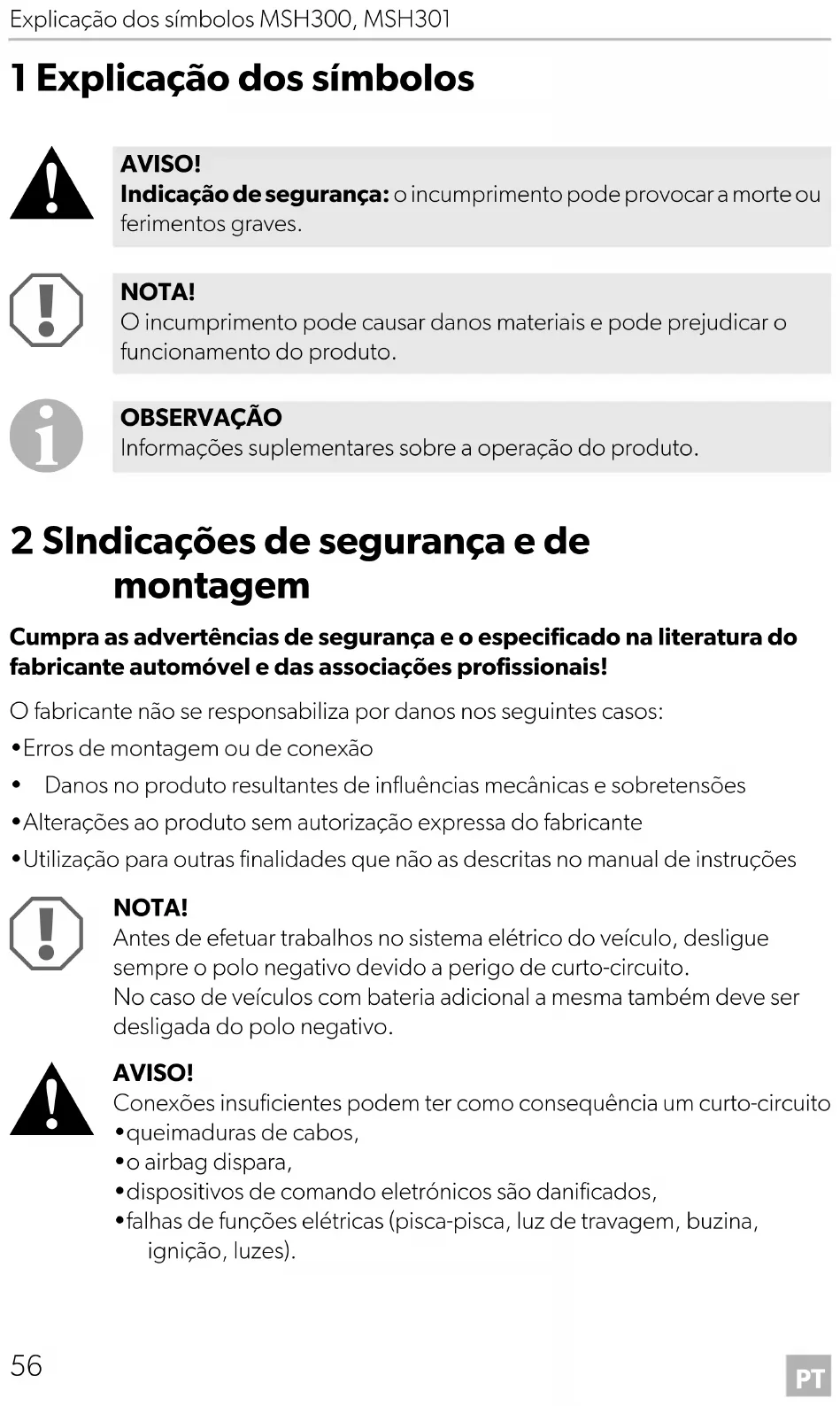 - falhas de funções elétricas (pisca-pisca, luz de travagem, buzina, ignição, luzes). AVISO! Indicação de segurança: o incumprimento pode provocar a morte ou ferimentos graves. NOTA! O incumprimento pode causar danos materiais e pode prejudicar o funcionamento do produto. OBSERVAÇÃO Informações suplementares sobre a operação do produto. MSH300--IO-16s.book Seite 56 Donnerstag, 13. Juli 2017 10:28 10PT MSH300, MSH301 SIndicações de segurança e de montagem