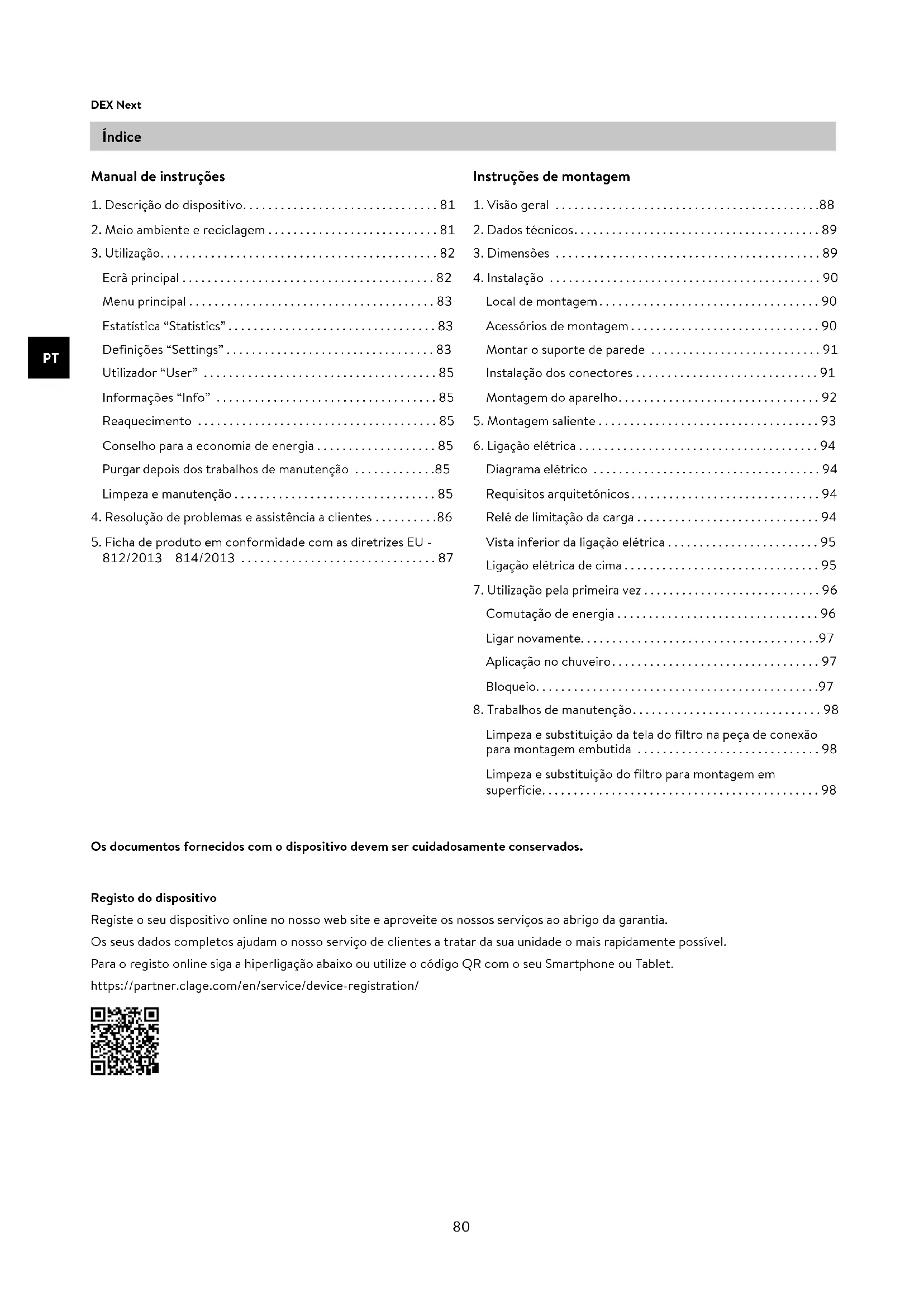 Índice Registo do dispositivo Registe o seu dispositivo online no nosso web site e aproveite os nossos serviços ao abrigo da garantia. Os seus dados completos ajudam o nosso serviço de clientes a tratar da sua unidade o mais rapidamente possível. Para o registo online siga a hiperligação abaixo ou utilize o código QR com o seu Smartphone ou Tablet. https://partner.clage.com/en/service/device-registration/ Os documentos fornecidos com o dispositivo devem ser cuidadosamente conservados. Manual de instruções . Descrição do dispositivo ............................... . Meio ambiente e reciclagem ........................... . Utilização ............................................ Ecrã principal ........................................ Menu principal ....................................... Estatística “Statistics” ................................. Definições “Settings” ................................. Utilizador “User” ..................................... Informações “Info” ................................... Reaquecimento ...................................... Conselho para a economia de energia ................... Purgar depois dos trabalhos de manutenção ............. Limpeza e manutenção ................................ . Resolução de problemas e assistência a clientes .......... . Ficha de produto em conformidade com as diretrizes EU - / / ............................... Instruções de montagem . Visão geral .......................................... . Dados técnicos ....................................... . Dimensões .......................................... . Instalação ........................................... Local de montagem ................................... Acessórios de montagem .............................. Montar o suporte de parede ........................... Instalação dos conectores ............................. Montagem do aparelho ................................ . Montagem saliente ................................... . Ligação elétrica ...................................... Diagrama elétrico .................................... Requisitos arquitetónicos .............................. Relé de limitação da carga ............................. Vista inferior da ligação elétrica ........................ Ligação elétrica de cima ............................... . Utilização pela primeira vez ............................ Comutação de energia ................................ Ligar novamente. . . . . . . . . . . . . . . . . . . . . . . . . . . . . . . . . . . . . . Aplicação no chuveiro ................................. Bloqueio. . . . . . . . . . . . . . . . . . . . . . . . . . . . . . . . . . . . . . . . . . . . . . Trabalhos de manutenção .............................. Limpeza e substituição da tela do filtro na peça de conexão para montagem embutida ............................. Limpeza e substituição do filtro para montagem em superfície ............................................CLAGE