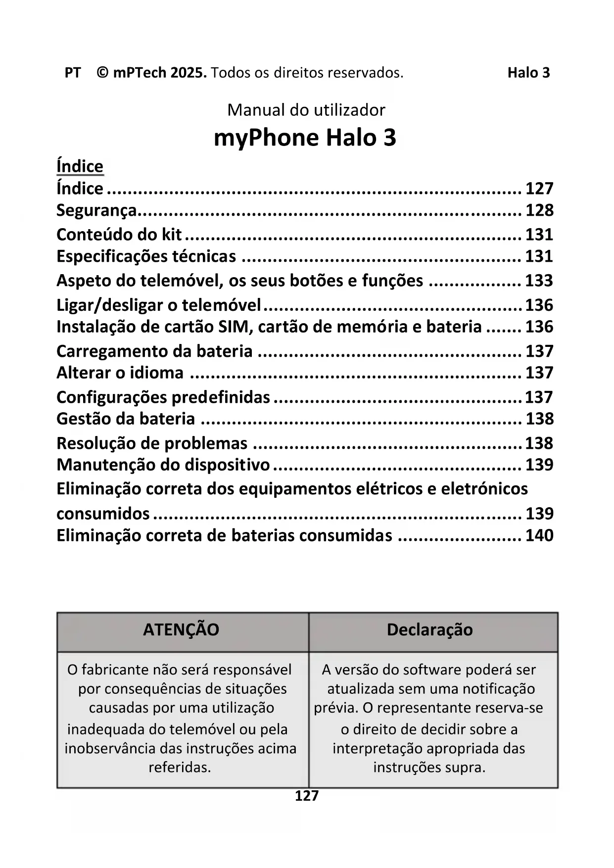 ATENÇÃO Declaração O fabricante não será responsável por consequências de situações causadas por uma utilização inadequada do telemóvel ou pela inobservância das instruções acima referidas. A versão do software poderá ser atualizada sem uma notificação prévia. O representante reserva-se o direito de decidir sobre a interpretação apropriada das instruções supra.PT © mPTech 2025. Todos os direitos reservados. Halo 3