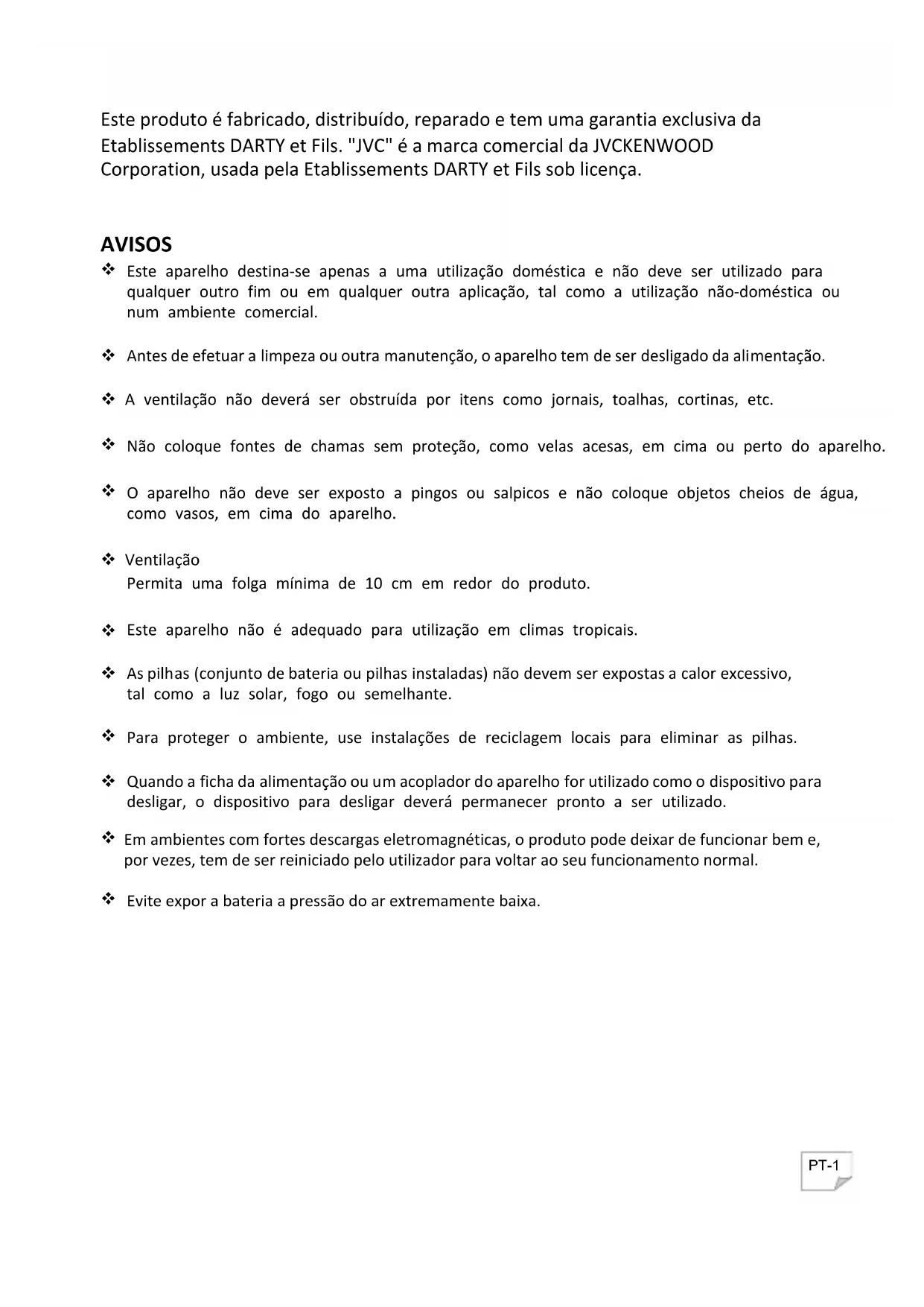 Evite expor a bateria a pressão do ar extremamente baixa. Este produto é fabricado, distribuído, reparado e tem uma garantia exclusiva da Etablissements DARTY et Fils. "JVC" é a marca comercial da JVCKENWOOD Corporation, usada pela Etablissements DARTY et Fils sob licença.Símbolo Esta marca é aplicada para mostrar que o equipamento se encontra em conformidade com a diretiva europeia de equipamento de rádio. As letras “CE” significam que os produtos vendidos no EEE foram avaliados com vista a cumprirem os elevados requisitos em matéria de segurança, saúde e ambiente. Manuseamento e utilização da bateria As pilhas devem ser manuseadas apenas por adultos (não fornecidas). Não permita que uma criança utilize este aparelho, a não ser que a tampa do compartimento das pilhas esteja bem fixada à unidade. A unidade utiliza 2 pilhas AAA, que se encontram acessíveis e podem ser substituídas. Retire a tampa do compartimento das pilhas da unidade e depois retire as pilhas. PT-2