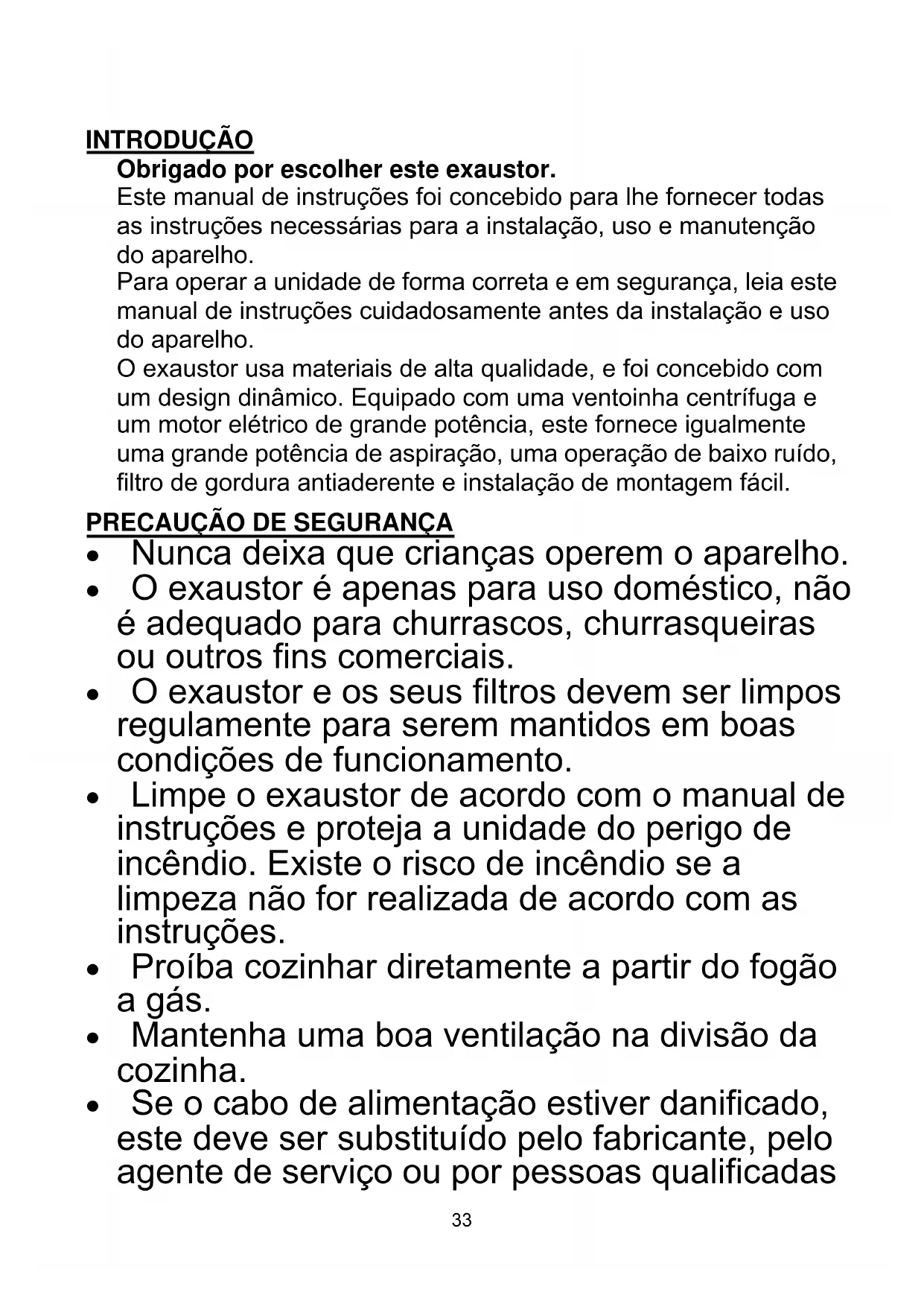 32INTRODUÇÃO Obrigado por escolher este exaustor. Este manual de instruções foi concebido para lhe fornecer todas as instruções necessárias para a instalação, uso e manutenção do aparelho. Para operar a unidade de forma correta e em segurança, leia este manual de instruções cuidadosamente antes da instalação e uso do aparelho. O exaustor usa materiais de alta qualidade, e foi concebido com um design dinâmico. Equipado com uma ventoinha centrífuga e um motor elétrico de grande potência, este fornece igualmente uma grande potência de aspiração, uma operação de baixo ruído, filtro de gordura antiaderente e instalação de montagem fácil.