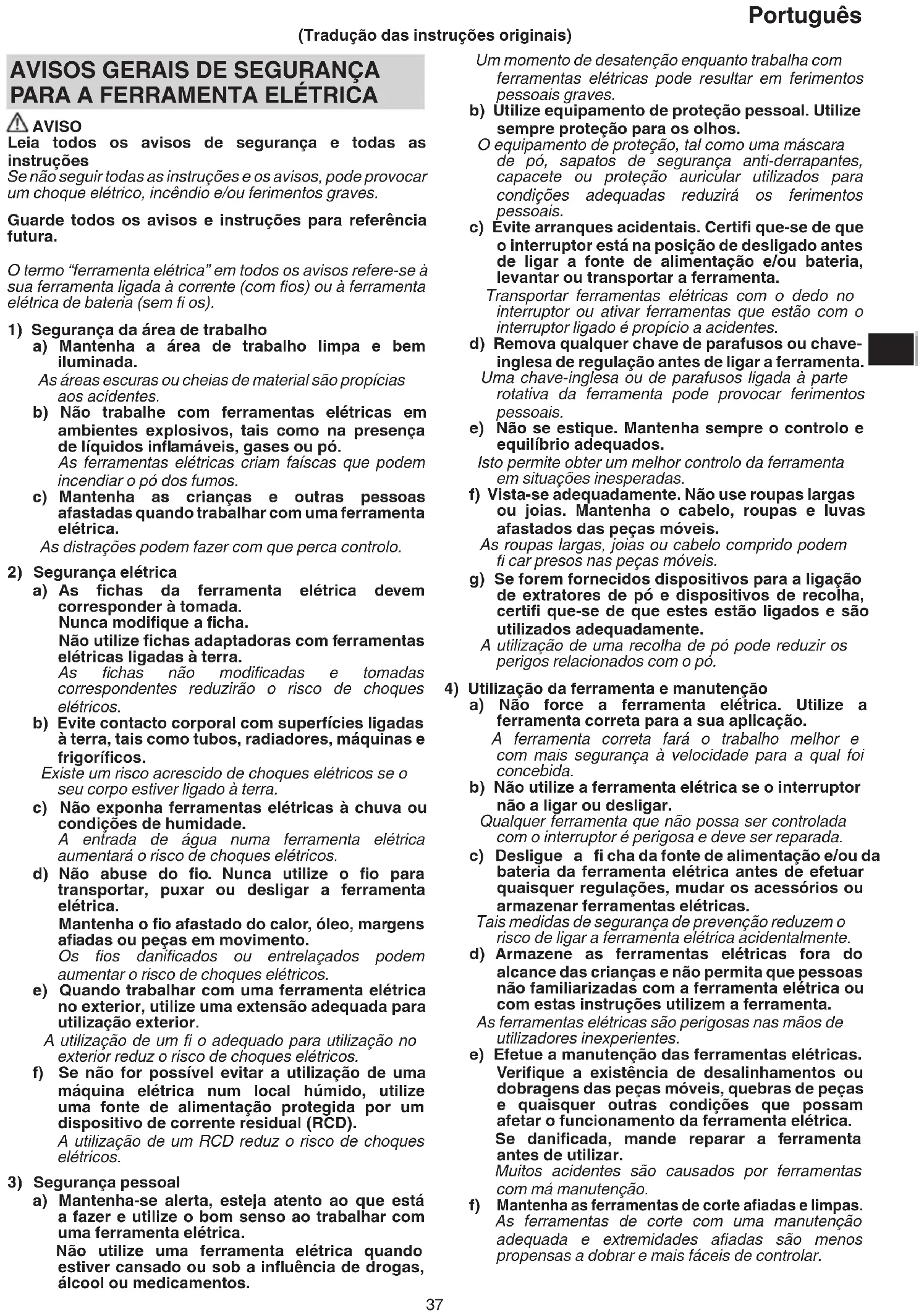El valor total de vibración declarado se ha medido según un método de prueba estándar, y permite comparar unas herramientas con otras. También resulta útil para llevar a cabo evaluaciones preliminares de exposición. ADVERTENCIA ○ La emisión de vibración durante la utilización real de la herramienta eléctrica puede ser diferente del valor total declarado en función de las formas de utilización de la herramienta. ○ Identifi que las medidas de seguridad para proteger al operador basadas en una estimación de exposición en condiciones reales de uso (teniendo en cuenta todas las partes del ciclo de funcionamiento, como tiempos durante los que la herramienta está apagada y durante los que funciona lentamente, además del tiempo de activación). NOTA Debido al programa continuo de investigación y desarrollo de HiKOKI estas especifi caciones están sujetas a cambio sin previo aviso. 0000BookG10SR4.indb360000BookG10SR4.indb36 2017/12/1917:26:072017/12/1917:26:0737 Português Um momento de desatenção enquanto trabalha com ferramentas elétricas pode resultar em ferimentos pessoais graves. b) Utilize equipamento de proteção pessoal. Utilize sempre proteção para os olhos. O equipamento de proteção, tal como uma máscara de pó, sapatos de segurança anti-derrapantes, capacete ou proteção auricular utilizados para condições adequadas reduzirá os ferimentos pessoais. c) Evite arranques acidentais. Certifi que-se de que o interruptor está na posição de desligado antes de ligar a fonte de alimentação e/ou bateria, levantar ou transportar a ferramenta. Transportar ferramentas elétricas com o dedo no interruptor ou ativar ferramentas que estão com o interruptor ligado é propício a acidentes. d) Remova qualquer chave de parafusos ou chave- inglesa de regulação antes de ligar a ferramenta. Uma chave-inglesa ou de parafusos ligada à parte rotativa da ferramenta pode provocar ferimentos pessoais. e) Não se estique. Mantenha sempre o controlo e equilíbrio adequados. Isto permite obter um melhor controlo da ferramenta em situações inesperadas. f) Vista-se adequadamente. Não use roupas largas ou joias. Mantenha o cabelo, roupas e luvas afastados das peças móveis. As roupas largas, joias ou cabelo comprido podem fi car presos nas peças móveis. g) Se forem fornecidos dispositivos para a ligação de extratores de pó e dispositivos de recolha, certifi que-se de que estes estão ligados e são utilizados adequadamente. A utilização de uma recolha de pó pode reduzir os perigos relacionados com o pó.