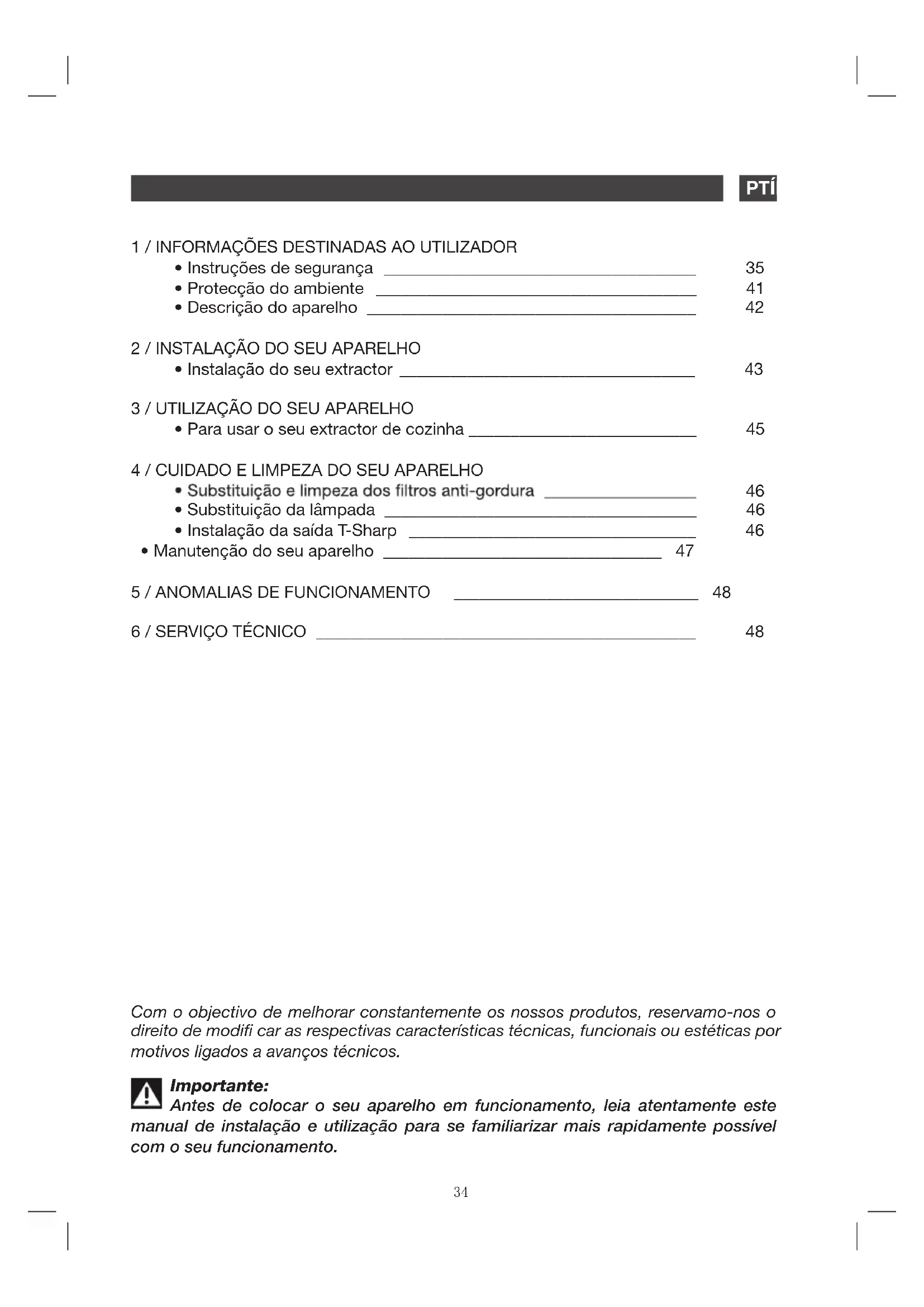 Com o objectivo de melhorar constantemente os nossos produtos, reservamo-nos o direito de modifi car as respectivas características técnicas, funcionais ou estéticas por motivos ligados a avanços técnicos. Importante: Antes de colocar o seu aparelho em funcionamento, leia atentamente este manual de instalação e utilização para se familiarizar mais rapidamente possível com o seu funcionamento.
