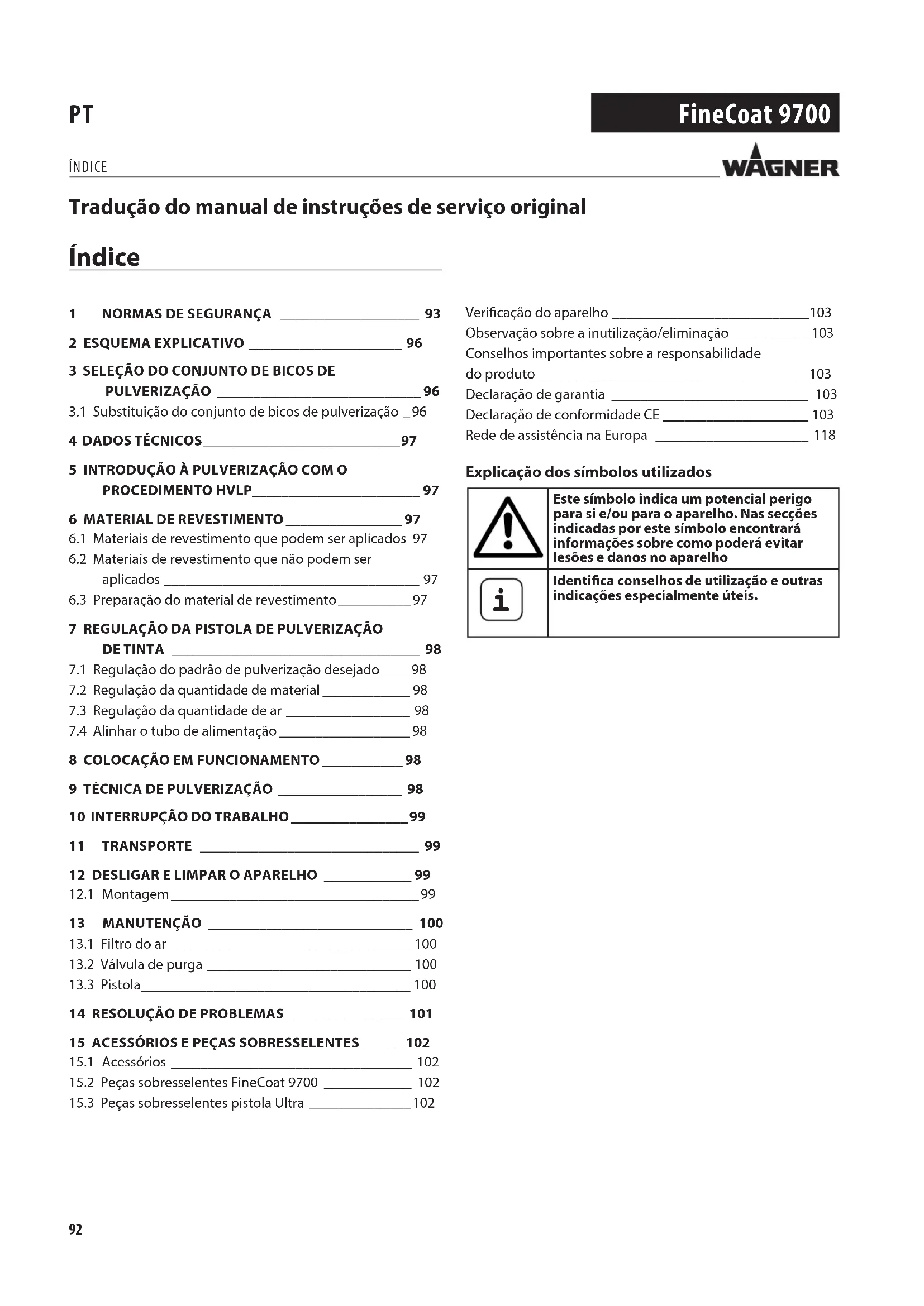 2 ESQUEMA EXPLICATIVO _____________________ 963 SELEÇÃO DO CONJUNTO DE BICOS DE PULVERIZAÇÃO ____________________________ 963.1 Substituição do conjunto de bicos de pulverização _ 964 DADOS TÉCNICOS ___________________________ 975 INTRODUÇÃO À PULVERIZAÇÃO COM O PROCEDIMENTO HVLP_______________________ 976 MATERIAL DE REVESTIMENTO ________________ 976.1 Materiais de revestimento que podem ser aplicados 976.2 Materiais de revestimento que não podem ser aplicados ___________________________________ 976.3 Preparação do material de revestimento __________ 977 REGULAÇÃO DA PISTOLA DE PULVERIZAÇÃO DE TINTA __________________________________ 987.1 Regulação do padrão de pulverização desejado ____ 987.2 Regulação da quantidade de material ____________ 987.3 Regulação da quantidade de ar _________________ 987.4 Alinhar o tubo de alimentação __________________ 988 COLOCAÇÃO EM FUNCIONAMENTO ___________ 989 TÉCNICA DE PULVERIZAÇÃO _________________ 9810 INTERRUPÇÃO DO TRABALHO ________________ 99 11 TRANSPORTE ______________________________ 99 12 DESLIGAR E LIMPAR O APARELHO ____________ 9912.1 Montagem __________________________________ 9913 MANUTENÇÃO ____________________________ 10013.1 Filtro do ar _________________________________ 10013.2 Válvula de purga ____________________________ 10013.3 Pistola_____________________________________ 10014 RESOLUÇÃO DE PROBLEMAS _______________ 10115 ACESSÓRIOS E PEÇAS SOBRESSELENTES _____ 10215.1 Acessórios _________________________________ 10215.2 Peças sobresselentes FineCoat 9700 ____________ 10215.3 Peças sobresselentes pistola Ultra ______________ 102Vericação do aparelho ___________________________ 103Observação sobre a inutilização/eliminação __________ 103Conselhos importantes sobre a responsabilidade do produto _____________________________________ 103Declaração de garantia ___________________________ 103Declaração de conformidade CE ____________________ 103Rede de assistência na Europa _____________________ 118 Explicação dos símbolos utilizados Este símbolo indica um potencial perigo para si e/ou para o aparelho. Nas secções indicadas por este símbolo encontrará informações sobre como poderá evitar lesões e danos no aparelho