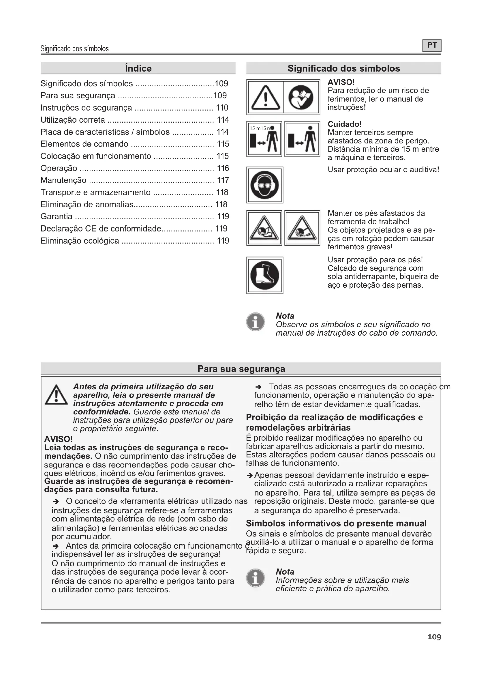 - Eliminação ecológica Signicado dos símbolos AVISO! Para redução de um risco de ferimentos, ler o manual de instruções! 15 m15 m Cuidado! Manter terceiros sempre afastados da zona de perigo. Distância mínima de 15 m entre a máquina e terceiros. Usar proteção ocular e auditiva! Manter os pés afastados da ferramenta de trabalho! Os objetos projetados e as pe- ças em rotação podem causar ferimentos graves! Usar proteção para os pés! Calçado de segurança com sola antiderrapante, biqueira de aço e proteção das pernas. Nota Observe os símbolos e seu signicado no manual de instruções do cabo de comando. Para sua segurança Antes da primeira utilização do seu aparelho, leia o presente manual de instruções atentamente e proceda em conformidade. Guarde este manual de instruções para utilização posterior ou para o proprietário seguinte. AVISO! Leia todas as instruções de segurança e reco- mendações. O não cumprimento das instruções de segurança e das recomendações pode causar cho- ques elétricos, incêndios e/ou ferimentos graves. Guarde as instruções de segurança e recomen- dações para consulta futura. Î O conceito de «ferramenta elétrica» utilizado nas instruções de segurança refere-se a ferramentas com alimentação elétrica de rede (com cabo de alimentação) e ferramentas elétricas acionadas por acumulador. Î Antes da primeira colocação em funcionamento é indispensável ler as instruções de segurança! O não cumprimento do manual de instruções e das instruções de segurança pode levar à ocor- rência de danos no aparelho e perigos tanto para o utilizador como para terceiros. Î Todas as pessoas encarregues da colocação em funcionamento, operação e manutenção do apa- relho têm de estar devidamente qualicadas. Proibição da realização de modificações e remodelações arbitrárias É proibido realizar modicações no aparelho ou fabricar aparelhos adicionais a partir do mesmo. Estas alterações podem causar danos pessoais ou falhas de funcionamento. Î Apenas pessoal devidamente instruído e espe- cializado está autorizado a realizar reparações no aparelho. Para tal, utilize sempre as peças de reposição originais. Deste modo, garante-se que a segurança do aparelho é preservada. Símbolos informativos do presente manual Os sinais e símbolos do presente manual deverão auxiliá-lo a utilizar o manual e o aparelho de forma rápida e segura. Nota Informações sobre a utilização mais eciente e prática do aparelho. ÍndicePara sua segurança p. 119