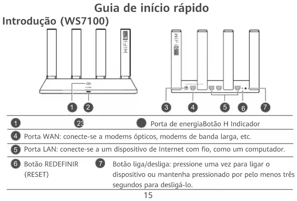 Área de detecção de NFC Botão REDEFINIR (RESET) Botão liga/desliga: pressione uma vez para ligar o dispositivo ou mantenha pressionado por pelo menos três segundos para desligá-lo. Porta WAN: conecte-se a modems ópticos, modems de banda larga, etc. Porta LAN: conecte-se a um dispositivo de Internet com o, como um computador. Porta de energiaBotão H Indicador