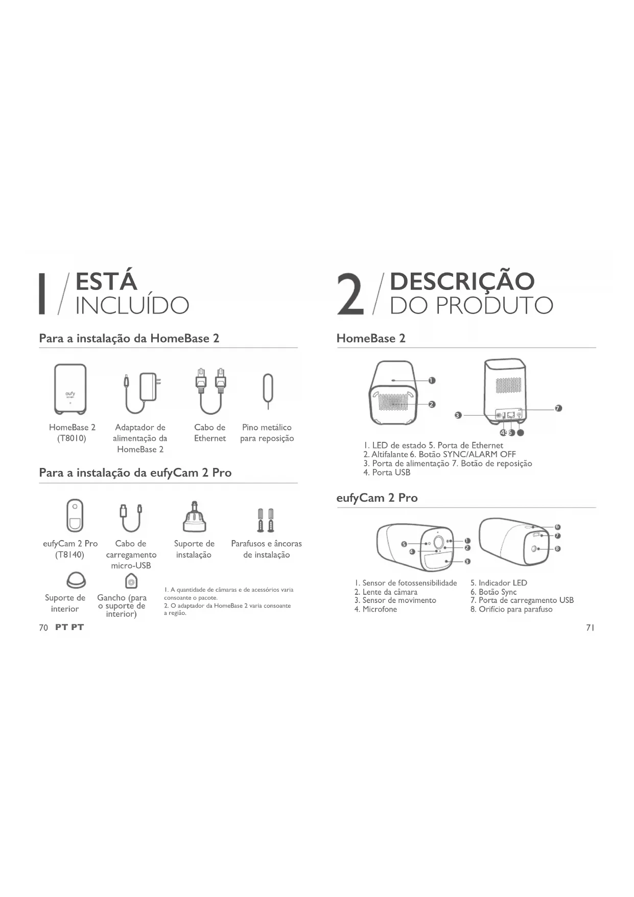 ESTÁ INCLUÍDO Para a instalação da HomeBase 2 HomeBase 2 (T8010) Adaptador de alimentação da HomeBase 2 Cabo de Ethernet Pino metálico para reposição Para a instalação da eufyCam 2 Pro eufyCam 2 Pro (T8140) Cabo de carregamento micro-USB Suporte de instalação Parafusos e âncoras de instalação DESCRIÇÃO DO PRODUTO HomeBase 2