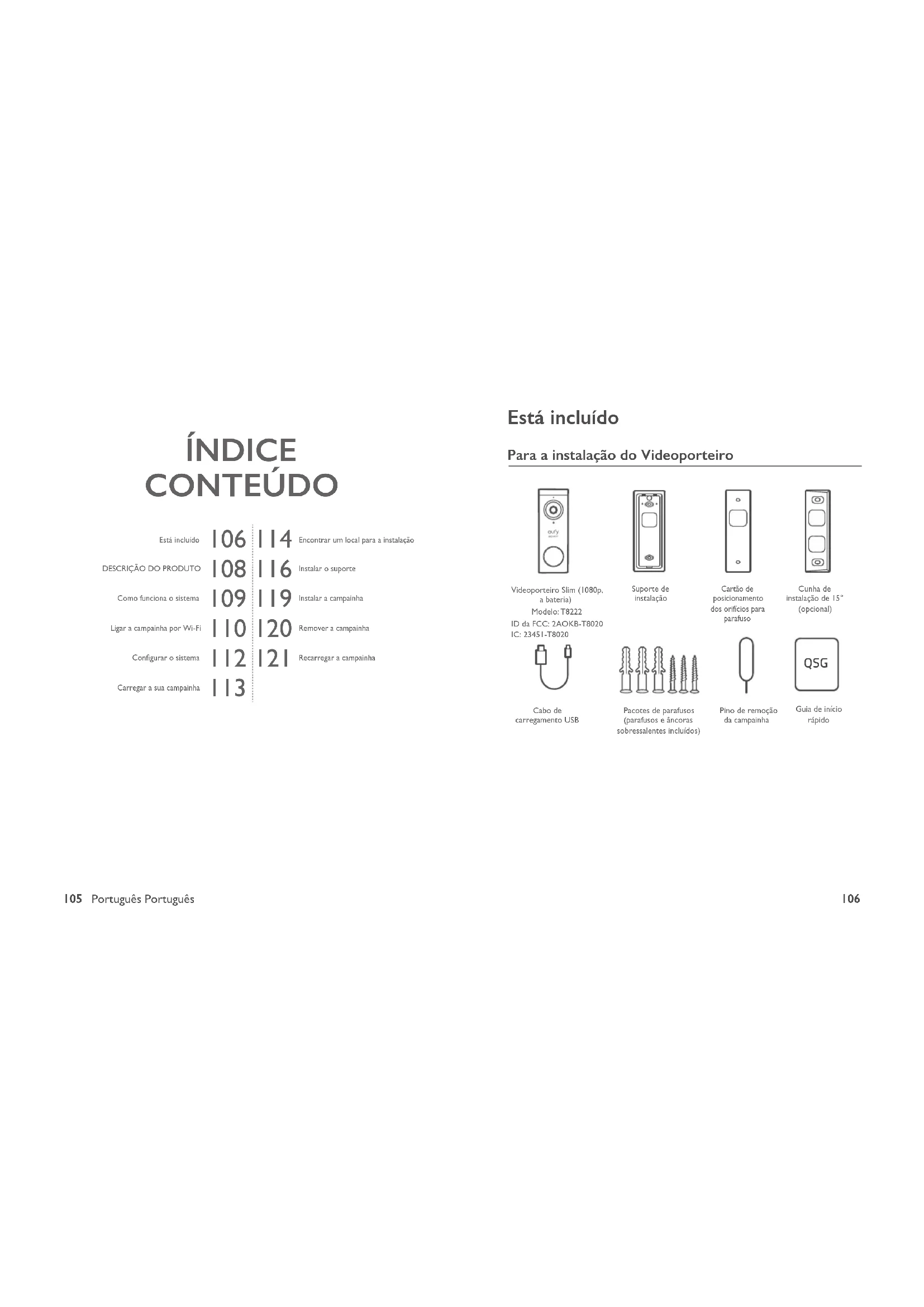 Está incluído Para a instalação do Videoporteiro QSG Videoporteiro Slim (1080p, a bateria)Modelo: T8222Pacotes de parafusos (parafusos e âncoras sobressalentes incluídos)Guia de início rápidoCartão de posicionamento dos orifícios para parafusoPino de remoção da campainhaCunha de instalação de 15° (opcional)Suporte de instalaçãoID da FCC: 2AOKB-T8020IC: 23451-T8020Cabo de carregamento USB107 Português Português