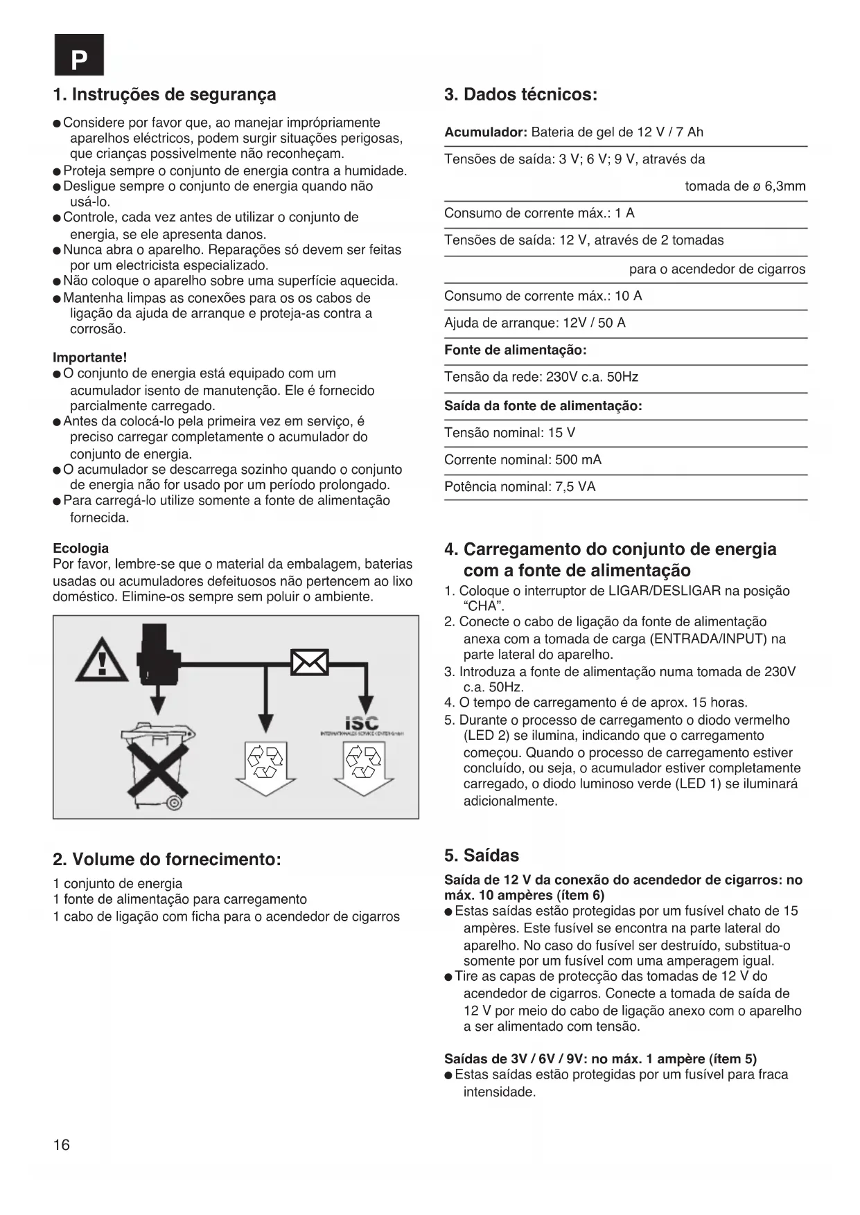 Considere por favor que, ao manejar imprópriamente aparelhos eléctricos, podem surgir situações perigosas, que crianças possivelmente não reconheçam. Proteja sempre o conjunto de energia contra a humidade. Desligue sempre o conjunto de energia quando não usá-lo. Controle, cada vez antes de utilizar o conjunto de energia, se ele apresenta danos. Nunca abra o aparelho. Reparações só devem ser feitas por um electricista especializado. Não coloque o aparelho sobre uma superfície aquecida. Mantenha limpas as conexões para os os cabos de ligação da ajuda de arranque e proteja-as contra a corrosão.Importante! O conjunto de energia está equipado com um acumulador isento de manutenção. Ele é fornecido parcialmente carregado. Antes da colocá-lo pela primeira vez em serviço, é preciso carregar completamente o acumulador do conjunto de energia. O acumulador se descarrega sozinho quando o conjunto de energia não for usado por um período prolongado. Para carregá-lo utilize somente a fonte de alimentação fornecida.EcologiaPor favor, lembre-se que o material da embalagem, bateriasusadas ou acumuladores defeituosos não pertencem ao lixodoméstico. Elimine-os sempre sem poluir o ambiente.
