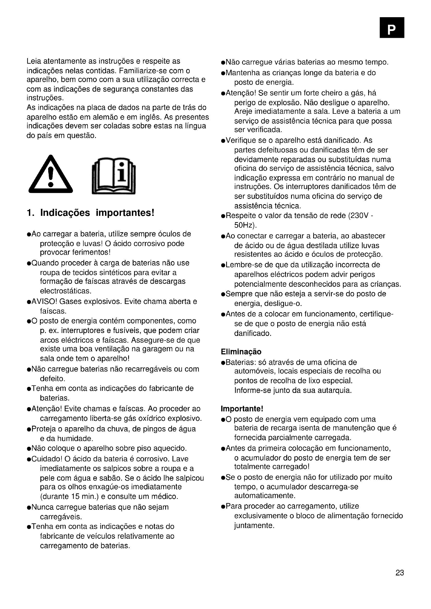 Ao carregar a bateria, utilize sempre óculos de protecção e luvas! O ácido corrosivo pode provocar ferimentos! Quando proceder à carga de baterias não use roupa de tecidos sintéticos para evitar a formação de faíscas através de descargas electrostáticas. AVISO! Gases explosivos. Evite chama aberta e faíscas. O posto de energia contém componentes, como p. ex. interruptores e fusíveis, que podem criar arcos eléctricos e faíscas. Assegure-se de que existe uma boa ventilação na garagem ou na sala onde tem o aparelho! Não carregue baterias não recarregáveis ou com defeito. Tenha em conta as indicações do fabricante de baterias. Atenção! Evite chamas e faíscas. Ao proceder ao carregamento liberta-se gás oxídrico explosivo. Proteja o aparelho da chuva, de pingos de água e da humidade. Não coloque o aparelho sobre piso aquecido. Cuidado! O ácido da bateria é corrosivo. Lave imediatamente os salpicos sobre a roupa e a pele com água e sabão. Se o ácido lhe salpicou para os olhos enxagúe-os imediatamente (durante 15 min.) e consulte um médico. Nunca carregue baterias que não sejam carregáveis. Tenha em conta as indicações e notas do fabricante de veículos relativamente ao carregamento de baterias. Não carregue várias baterias ao mesmo tempo. Mantenha as crianças longe da bateria e do posto de energia. Atenção! Se sentir um forte cheiro a gás, há perigo de explosão. Não desligue o aparelho. Areje imediatamente a sala. Leve a bateria a um serviço de assistência técnica para que possa ser verificada. Verifique se o aparelho está danificado. As partes defeituosas ou danificadas têm de ser devidamente reparadas ou substituídas numa oficina do serviço de assistência técnica, salvo indicação expressa em contrário no manual de instruções. Os interruptores danificados têm de ser substituídos numa oficina do serviço de assistência técnica. Respeite o valor da tensão de rede (230V - 50Hz). Ao conectar e carregar a bateria, ao abastecer de ácido ou de água destilada utilize luvas resistentes ao ácido e óculos de protecção. Lembre-se de que da utilização incorrecta de aparelhos eléctricos podem advir perigos potencialmente desconhecidos para as crianças. Sempre que não esteja a servir-se do posto de energia, desligue-o. Antes de a colocar em funcionamento, certifique- se de que o posto de energia não está danificado. Eliminação Baterias: só através de uma oficina de automóveis, locais especiais de recolha ou pontos de recolha de lixo especial. Informe-se junto da sua autarquia. Importante! O posto de energia vem equipado com uma bateria de recarga isenta de manutenção que é fornecida parcialmente carregada. Antes da primeira colocação em funcionamento, o acumulador do posto de energia tem de ser totalmente carregado! Se o posto de energia não for utilizado por muito tempo, o acumulador descarrega-se automaticamente. Para proceder ao carregamento, utilize exclusivamente o bloco de alimentação fornecido juntamente. P24 Protecção do ambiente Lembre-se de que o lugar do material da embalagem, das baterias usadas ou dos acumuladores defeituosos não é no caixote do lixo. Encaminhe-os para os locais adequados para que possam ser reciclados.