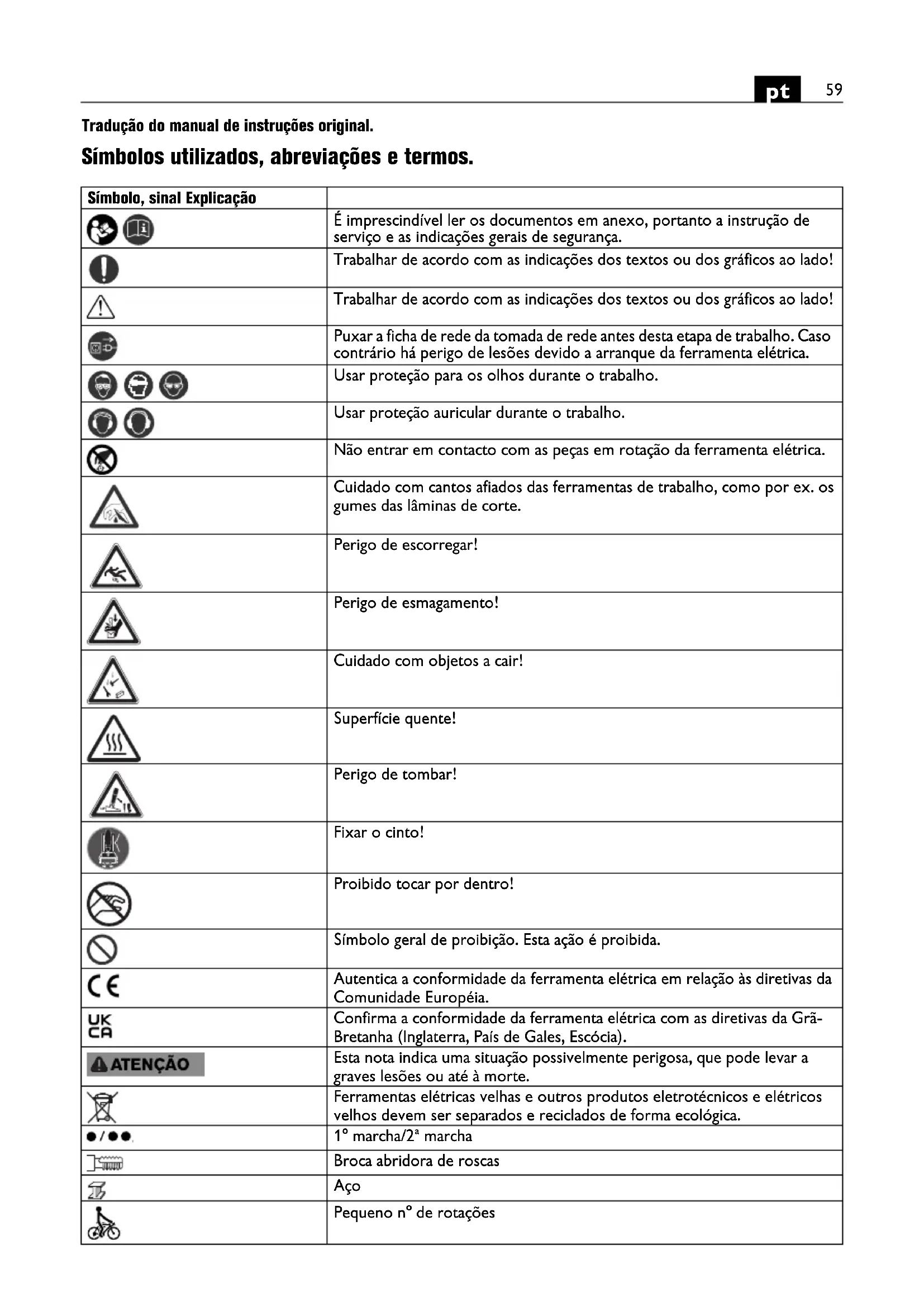 Tradução do manual de instruções original. Símbolos utilizados, abreviações e termos. Símbolo, sinal Explicação É imprescindível ler os documentos em anexo, portanto a instrução de serviço e as indicações gerais de segurança. Trabalhar de acordo com as indicações dos textos ou dos gráficos ao lado! Trabalhar de acordo com as indicações dos textos ou dos gráficos ao lado! Puxar a ficha de rede da tomada de rede antes desta etapa de trabalho. Caso contrário há perigo de lesões devido a arranque da ferramenta elétrica. Usar proteção para os olhos durante o trabalho. Usar proteção auricular durante o trabalho. Não entrar em contacto com as peças em rotação da ferramenta elétrica. Cuidado com cantos afiados das ferramentas de trabalho, como por ex. os gumes das lâminas de corte. Perigo de escorregar! Perigo de esmagamento! Cuidado com objetos a cair! Superfície quente! Perigo de tombar! Fixar o cinto! Proibido tocar por dentro! Símbolo geral de proibição. Esta ação é proibida. Autentica a conformidade da ferramenta elétrica em relação às diretivas da Comunidade Européia. Confirma a conformidade da ferramenta elétrica com as diretivas da Grã- Bretanha (Inglaterra, País de Gales, Escócia). Esta nota indica uma situação possivelmente perigosa, que pode levar a graves lesões ou até à morte. Ferramentas elétricas velhas e outros produtos eletrotécnicos e elétricos velhos devem ser separados e reciclados de forma ecológica. 1° marcha/2ª marcha Broca abridora de roscas Aço Pequeno n° de rotações60