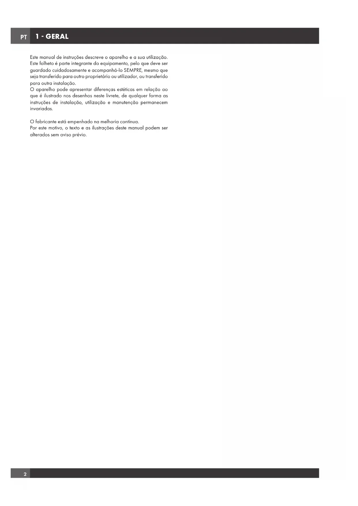 Este manual de instruções descreve o aparelho e a sua utilização. Este folheto é parte integrante do equipamento, pelo que deve ser guardado cuidadosamente e acompanhá-lo SEMPRE, mesmo que seja transferido para outro proprietário ou utilizador, ou transferido para outra instalação. O aparelho pode apresentar diferenças estéticas em relação ao que é ilustrado nos desenhos neste livrete, de qualquer forma as instruções de instalação, utilização e manutenção permanecem invariadas. O fabricante está empenhado na melhoria contínua. Por este motivo, o texto e as ilustrações deste manual podem ser alterados sem aviso prévio.PT