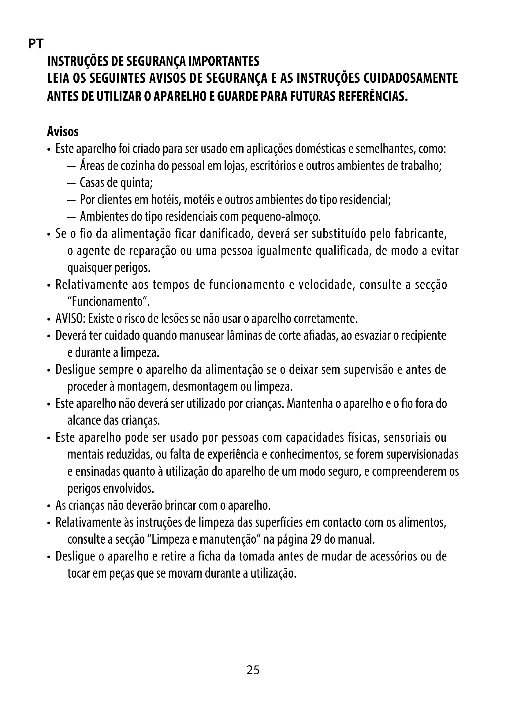 - Desligue o aparelho e retire a ficha da tomada antes de mudar de acessórios ou de tocar em peças que se movam durante a utilização.PT