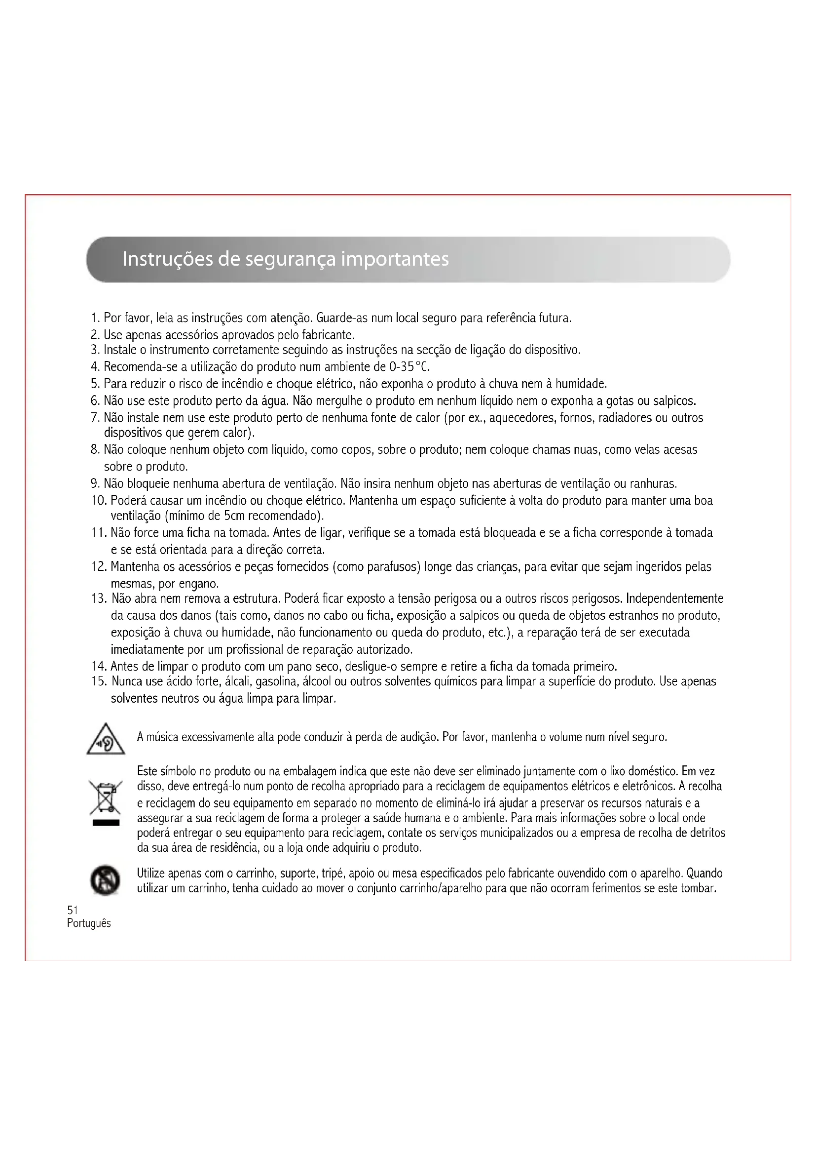 - Gli altoparlanti EDIFIER generano pochissimo rumore, mentre il rumore di background di alcuni dispositivi audio è decisamente troppo alto. Scollegare i cavi audio e alzare il volume, se non si avverte alcun rumore a 1 metro di distanza dall'altoparlante, non sussiste alcun problema con questo prodotto. Per sapere di più su EDIFIER, visitare il sito www.edifier.com Per domande sulla garanzia EDIFIER, visitare la relativa pagina del paese sul sito www.edifier.com e consultare la sezione intitolata Condizioni di garanzia. USA e Canada: service@edifier.ca Sud America: Visitare il sito www.edifier.com (inglese) o www.edifierla.com (spagnolo/portoghese) per informazioni locali di contatto.51 Português Instruções de segurança importantes A música excessivamente alta pode conduzir à perda de audição. Por favor, mantenha o volume num nível seguro. Este símbolo no produto ou na embalagem indica que este não deve ser eliminado juntamente com o lixo doméstico. Em vez disso, deve entregá-lo num ponto de recolha apropriado para a reciclagem de equipamentos elétricos e eletrônicos. A recolha e reciclagem do seu equipamento em separado no momento de eliminá-lo irá ajudar a preservar os recursos naturais e a assegurar a sua reciclagem de forma a proteger a saúde humana e o ambiente. Para mais informações sobre o local onde poderá entregar o seu equipamento para reciclagem, contate os serviços municipalizados ou a empresa de recolha de detritos da sua área de residência, ou a loja onde adquiriu o produto. Utilize apenas com o carrinho, suporte, tripé, apoio ou mesa especificados pelo fabricante ouvendido com o aparelho. Quando utilizar um carrinho, tenha cuidado ao mover o conjunto carrinho/aparelho para que não ocorram ferimentos se este tombar.
