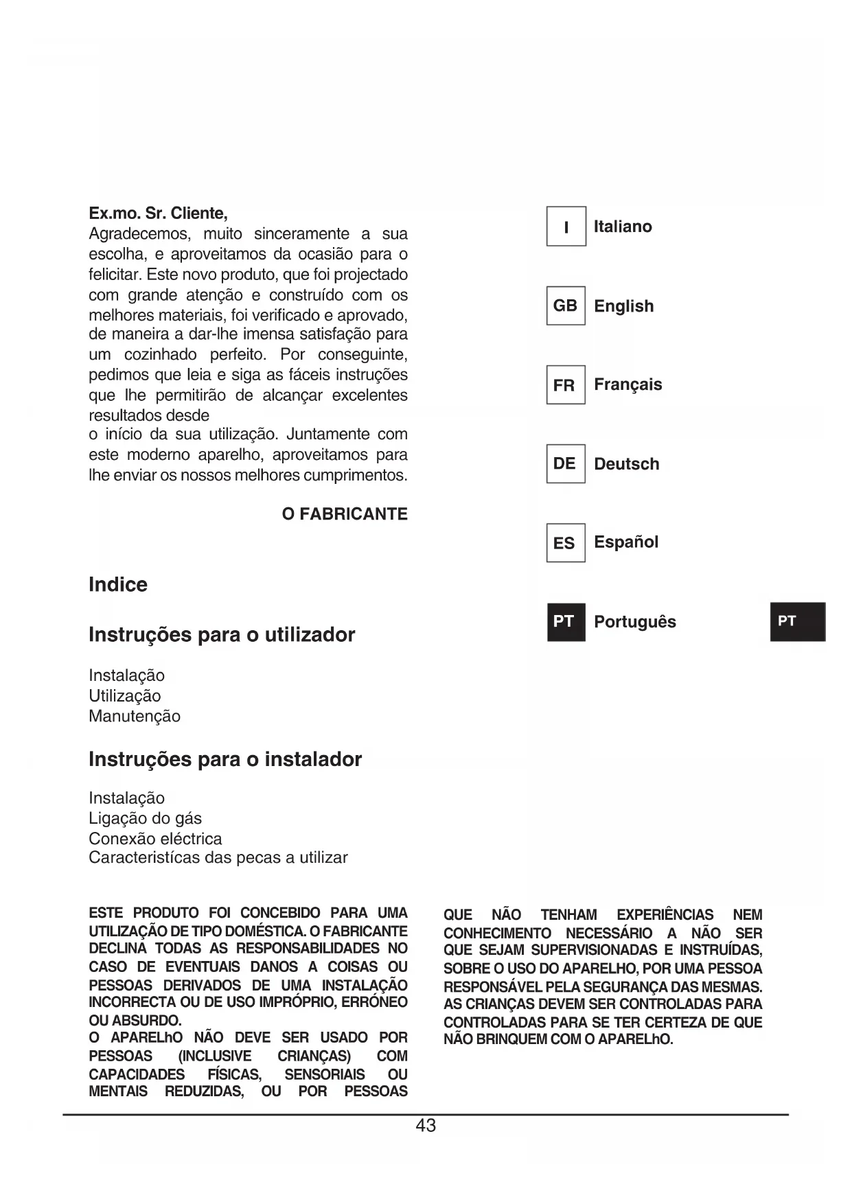QUE NÃO TENHAM EXPERIÊNCIAS NEM CONHECIMENTO NECESSÁRIO A NÃO SER QUE SEJAM SUPERVISIONADAS E INSTRUÍDAS, SOBRE O USO DO APARELHO, POR UMA PESSOA RESPONSÁVEL PELA SEGURANÇA DAS MESMAS. AS CRIANÇAS DEVEM SER CONTROLADAS PARA CONTROLADAS PARA SE TER CERTEZA DE QUE NÃO BRINQUEM COM O APARELhO. Ex.mo. Sr. Cliente, Agradecemos, muito sinceramente a sua escolha, e aproveitamos da ocasião para o felicitar. Este novo produto, que foi projectado com grande atenção e construído com os melhores materiais, foi verificado e aprovado, de maneira a dar-lhe imensa satisfação para um cozinhado perfeito. Por conseguinte, pedimos que leia e siga as fáceis instruções que lhe permitirão de alcançar excelentes resultados desde o início da sua utilização. Juntamente com este moderno aparelho, aproveitamos para lhe enviar os nossos melhores cumprimentos. O FABRICANTE Italiano