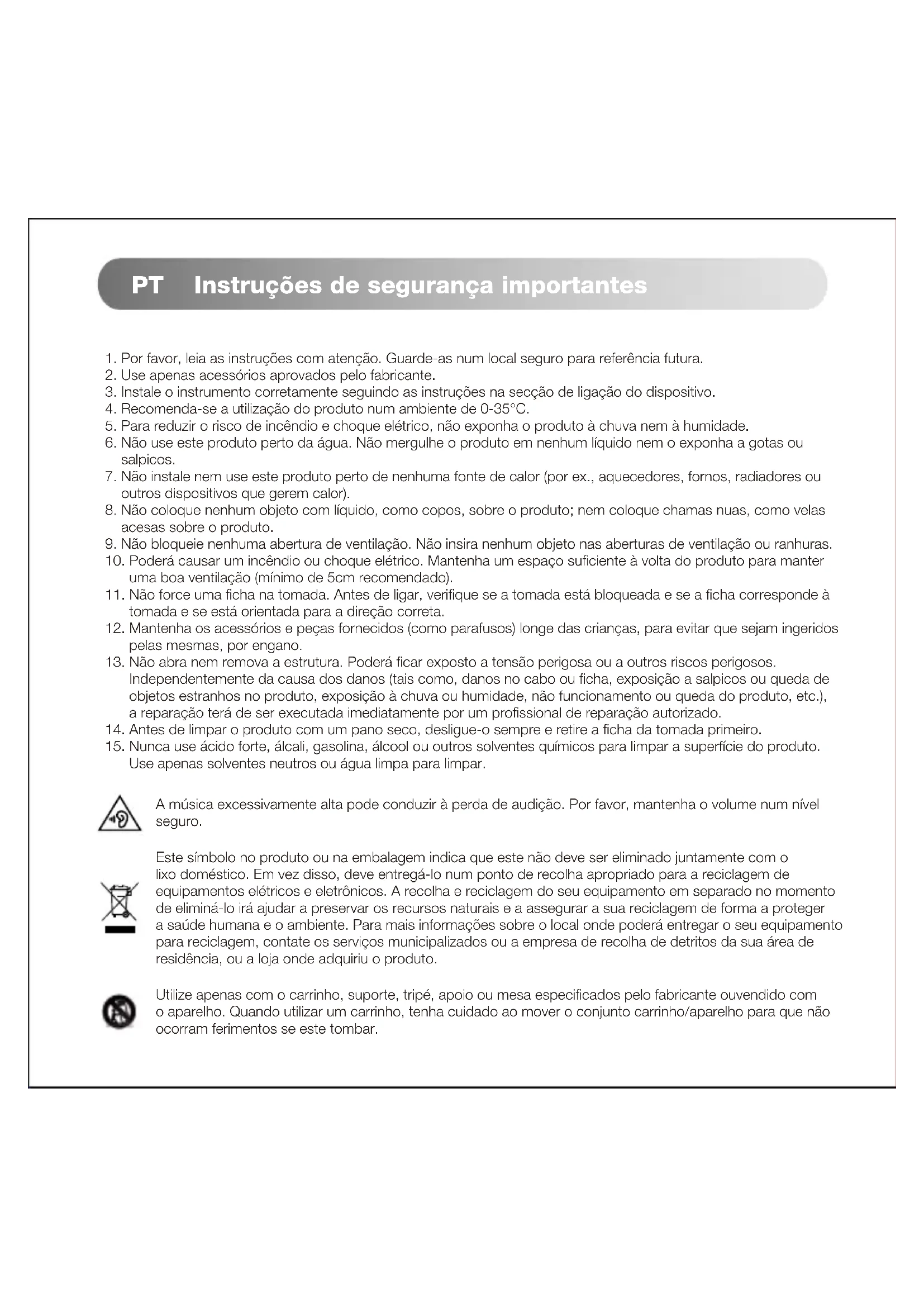 Use apenas solventes neutros ou água limpa para limpar. A música excessivamente alta pode conduzir à perda de audição. Por favor, mantenha o volume num nível seguro. Este símbolo no produto ou na embalagem indica que este não deve ser eliminado juntamente com o lixo doméstico. Em vez disso, deve entregá-lo num ponto de recolha apropriado para a reciclagem de equipamentos elétricos e eletrônicos. A recolha e reciclagem do seu equipamento em separado no momento de eliminá-lo irá ajudar a preservar os recursos naturais e a assegurar a sua reciclagem de forma a proteger a saúde humana e o ambiente. Para mais informações sobre o local onde poderá entregar o seu equipamento para reciclagem, contate os serviços municipalizados ou a empresa de recolha de detritos da sua área de residência, ou a loja onde adquiriu o produto. Utilize apenas com o carrinho, suporte, tripé, apoio ou mesa especificados pelo fabricante ouvendido com o aparelho. Quando utilizar um carrinho, tenha cuidado ao mover o conjunto carrinho/aparelho para que não ocorram ferimentos se este tombar.Instruções de segurança importantes Este símbolo indica que o produto destina-se apenas ao uso no interior. Este símbolo indica que o produto é CLASSE II ou um dispositivo elétrico com duplo isolamento sem ligação à terra necessária. Aviso de potência: