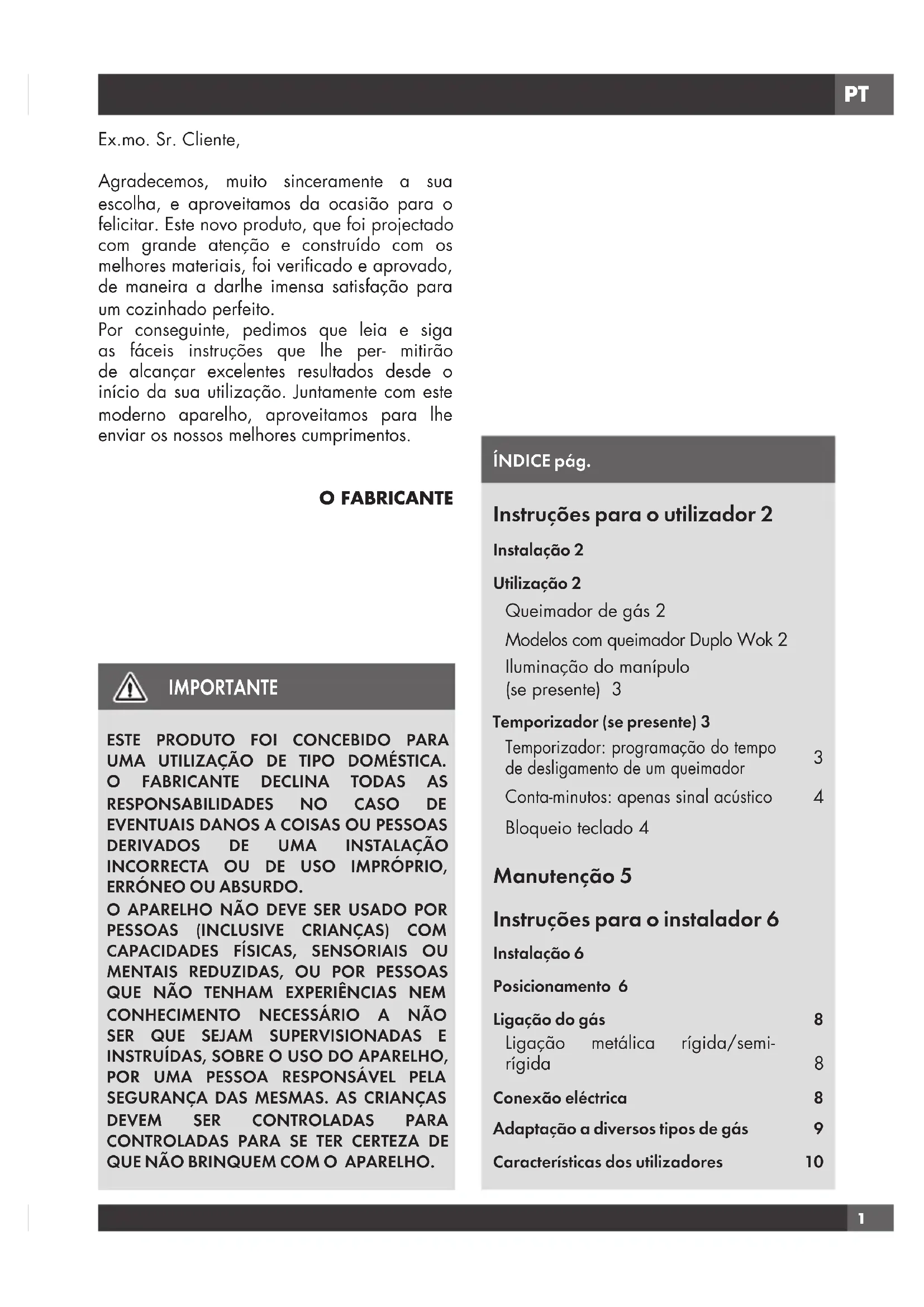 QUE NÃO BRINQUEM COM O APARELHO. ÍNDICE pág. Instruções para o utilizador 2 Instalação 2 Utilização 2 Queimador de gás 2 Modelos com queimador Duplo Wok 2 Iluminação do manípulo (se presente) 3 Temporizador (se presente) 3 Temporizador: programação do tempo de desligamento de um queimador