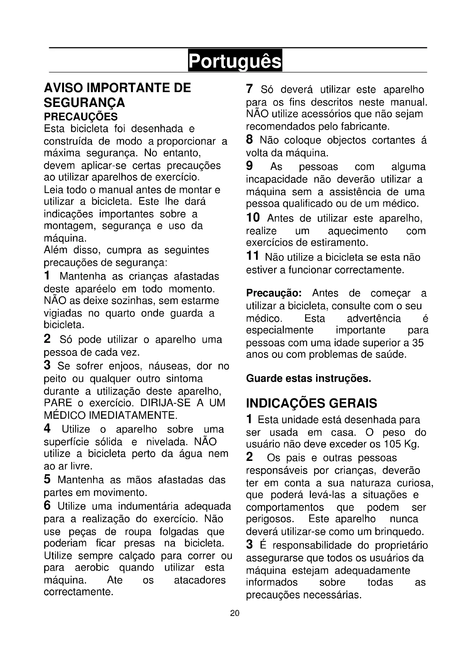 Não utilize a bicicleta se esta não estiver a funcionar correctamente. Precaução: Antes de começar a utilizar a bicicleta, consulte com o seu médico. Esta advertência é especialmente importante para pessoas com uma idade superior a 35 anos ou com problemas de saúde. Guarde estas instruções.