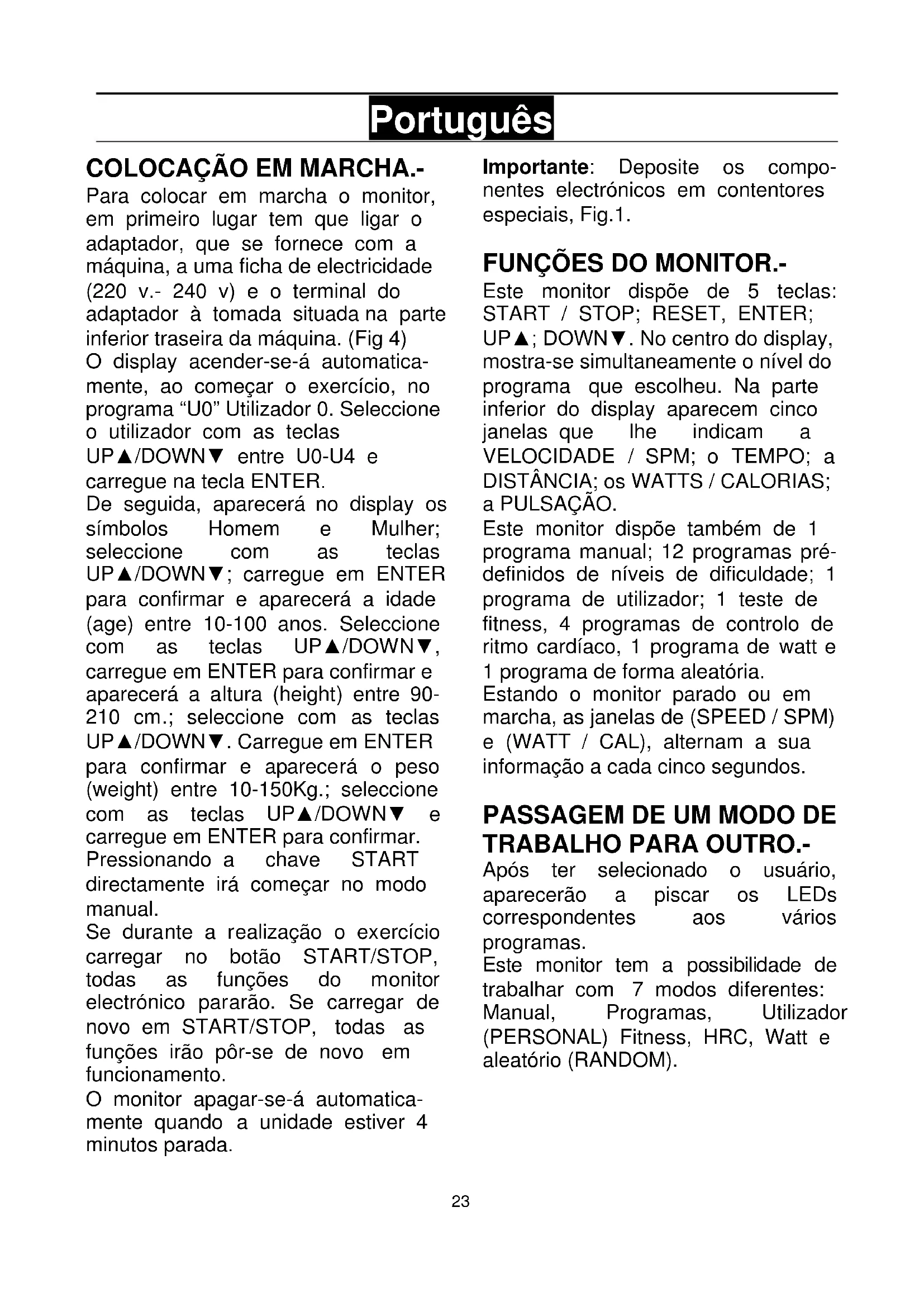 Para colocar em marcha o monitor, em primeiro lugar tem que ligar o adaptador, que se fornece com a máquina, a uma ficha de electricidade (220 v.- 240 v) e o terminal do adaptador à tomada situada na parte inferior traseira da máquina. (Fig 4) O display acender-se-á automatica- mente, ao começar o exercício, no programa “U0” Utilizador 0. Seleccione o utilizador com as teclas UP▲/DOWN▼ entre U0-U4 e carregue na tecla ENTER. De seguida, aparecerá no display os símbolos Homem e Mulher; seleccione com as teclas UP▲/DOWN▼; carregue em ENTER para confirmar e aparecerá a idade (age) entre 10-100 anos. Seleccione com as teclas UP▲/DOWN▼, carregue em ENTER para confirmar e aparecerá a altura (height) entre 90- 210 cm.; seleccione com as teclas UP▲/DOWN▼. Carregue em ENTER para confirmar e aparecerá o peso (weight) entre 10-150Kg.; seleccione com as teclas UP▲/DOWN▼ e carregue em ENTER para confirmar. Pressionando a chave START directamente irá começar no modo manual. Se durante a realização o exercício carregar no botão START/STOP, todas as funções do monitor electrónico pararão. Se carregar de novo em START/STOP, todas as funções irão pôr-se de novo em funcionamento. O monitor apagar-se-á automatica- mente quando a unidade estiver 4 minutos parada. Importante: Deposite os compo- nentes electrónicos em contentores especiais, Fig.1.