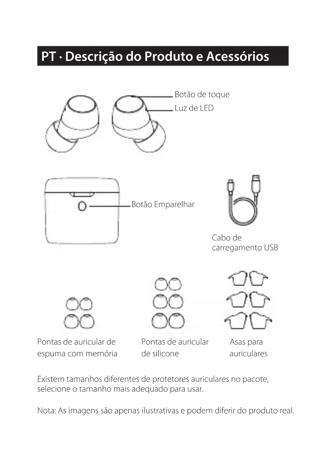 - Non utilizzare oggetti appuntiti per grattare la superficie del prodotto al fine di evitare di danneggiare il rivestimento e compromettere l'aspetto estetico. ■ ManutenzioneEdif ier International Limited P.O. Box 6264 General Post Off ice Hong Kong www.edif ier.com 2019 Edif ier International Limited. Tutti i diritti riservati. Stampato in China COMUNICAZIONE: Per necessità di miglioramenti tecnici e aggiornamenti del sistema le informazioni qui contenute possono essere soggette a modifiche periodiche senza preavviso. I prodotti EDIFIER verranno personalizzati per applicazioni diverse. Le immagini mostrate in questo manuale possono differire leggermente dal prodotto reale. L'immagine è solo a titolo indicativo, fa fede il prodotto vero e proprio.Existem tamanhos diferentes de protetores auriculares no pacote, selecione o tamanho mais adequado para usar. Nota: As imagens são apenas ilustrativas e podem diferir do produto real. PT · Descrição do Produto e Acessórios Luz de LED Botão de toque Cabo de carregamento USB Botão Emparelhar Pontas de auricular de silicone Pontas de auricular de espuma com memória Asas para auriculares■ Instrução de Uso ● Modo de utilização das asas dos auriculares Mantenha o auricular e a asa do auricular na mesma direção Coloque a asa do auricular por cima do auricular Belisque a ponta do auricular de espuma com memória e coloque-a por cima do auricular Fixe o auricular manualmente e solte até a ponta do auricular de espuma com memória ressaltar Coloque a ponta do auricular por cima do auricular ● Modo de utilização das pontas de auricular de espuma com memória■ Manual de Utilizador Entrada nominal: 5V 55mA (auscultadores) 5V 500mA (caixa de carregamento) ● Carregar os auriculares