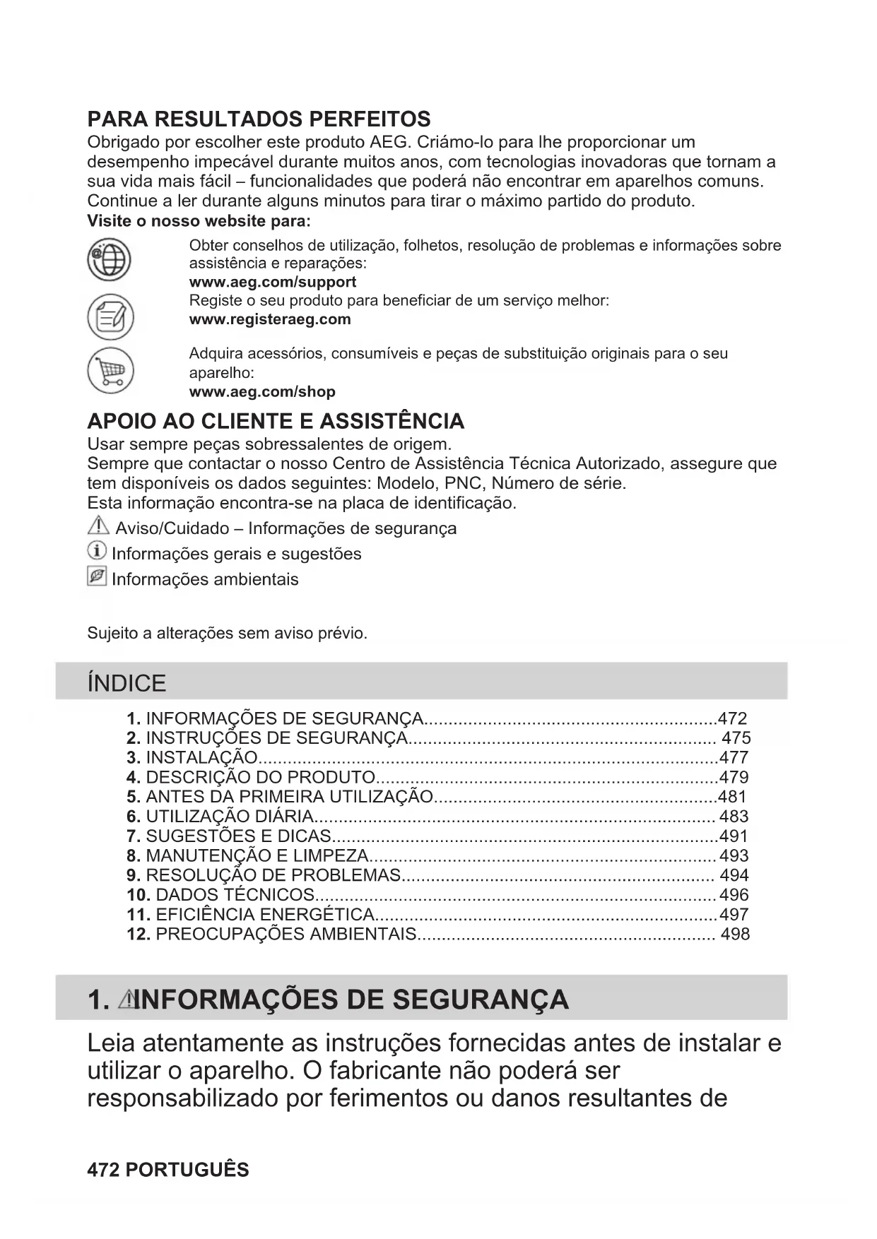 Usar sempre peças sobressalentes de origem.Sempre que contactar o nosso Centro de Assistência Técnica Autorizado, assegure quetem disponíveis os dados seguintes: Modelo, PNC, Número de série.Esta informação encontra-se na placa de identificação. Aviso/Cuidado – Informações de segurança Informações gerais e sugestões Informações ambientaisSujeito a alterações sem aviso prévio. ÍNDICE 1. INFORMAÇÕES DE SEGURANÇA............................................................4722. INSTRUÇÕES DE SEGURANÇA............................................................... 475