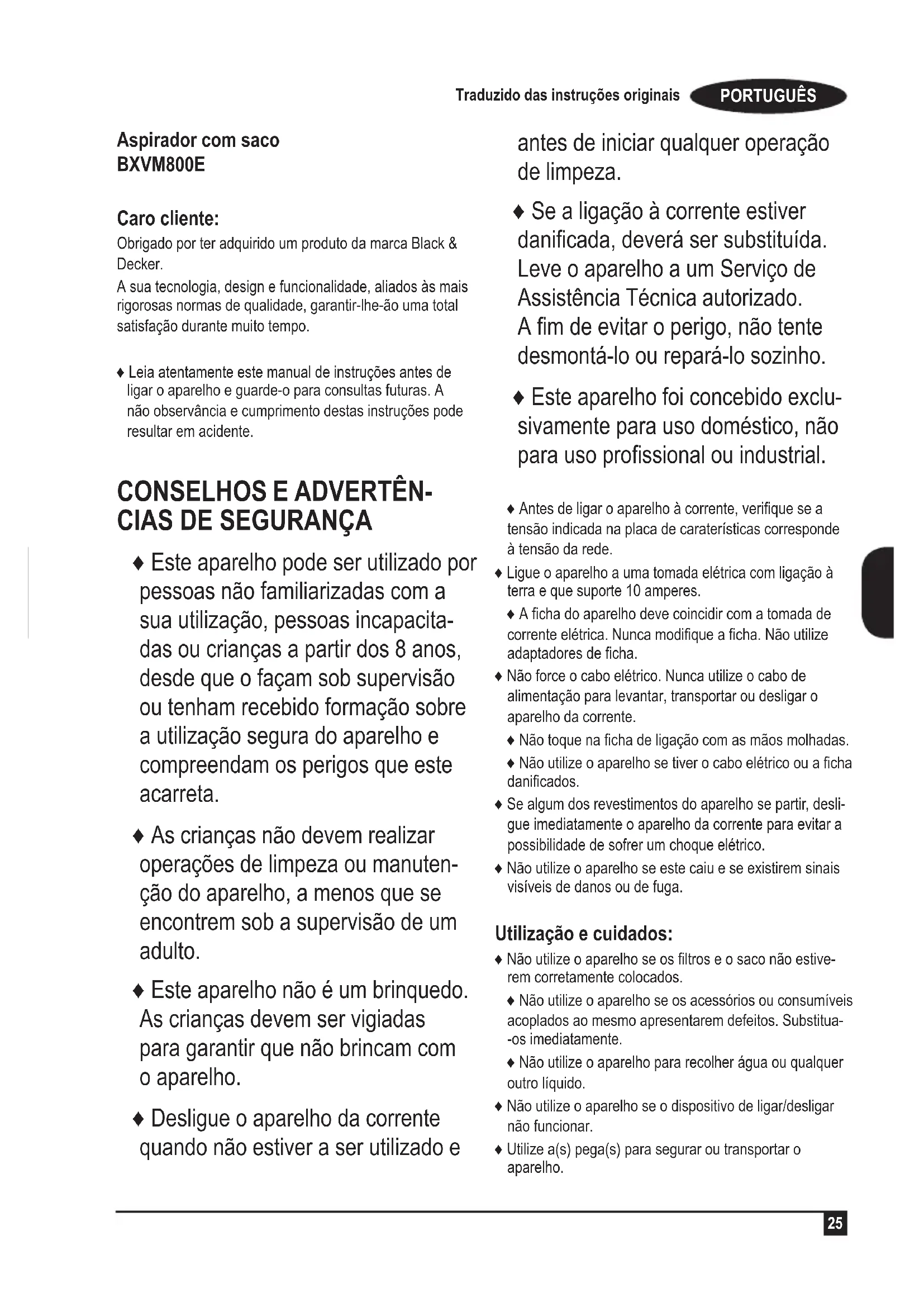 Aspirador com saco BXVM800E Caro cliente: Obrigado por ter adquirido um produto da marca Black & Decker. A sua tecnologia, design e funcionalidade, aliados às mais rigorosas normas de qualidade, garantir-lhe-ão uma total satisfação durante muito tempo. ♦ Leia atentamente este manual de instruções antes de ligar o aparelho e guarde-o para consultas futuras. A não observância e cumprimento destas instruções pode resultar em acidente.