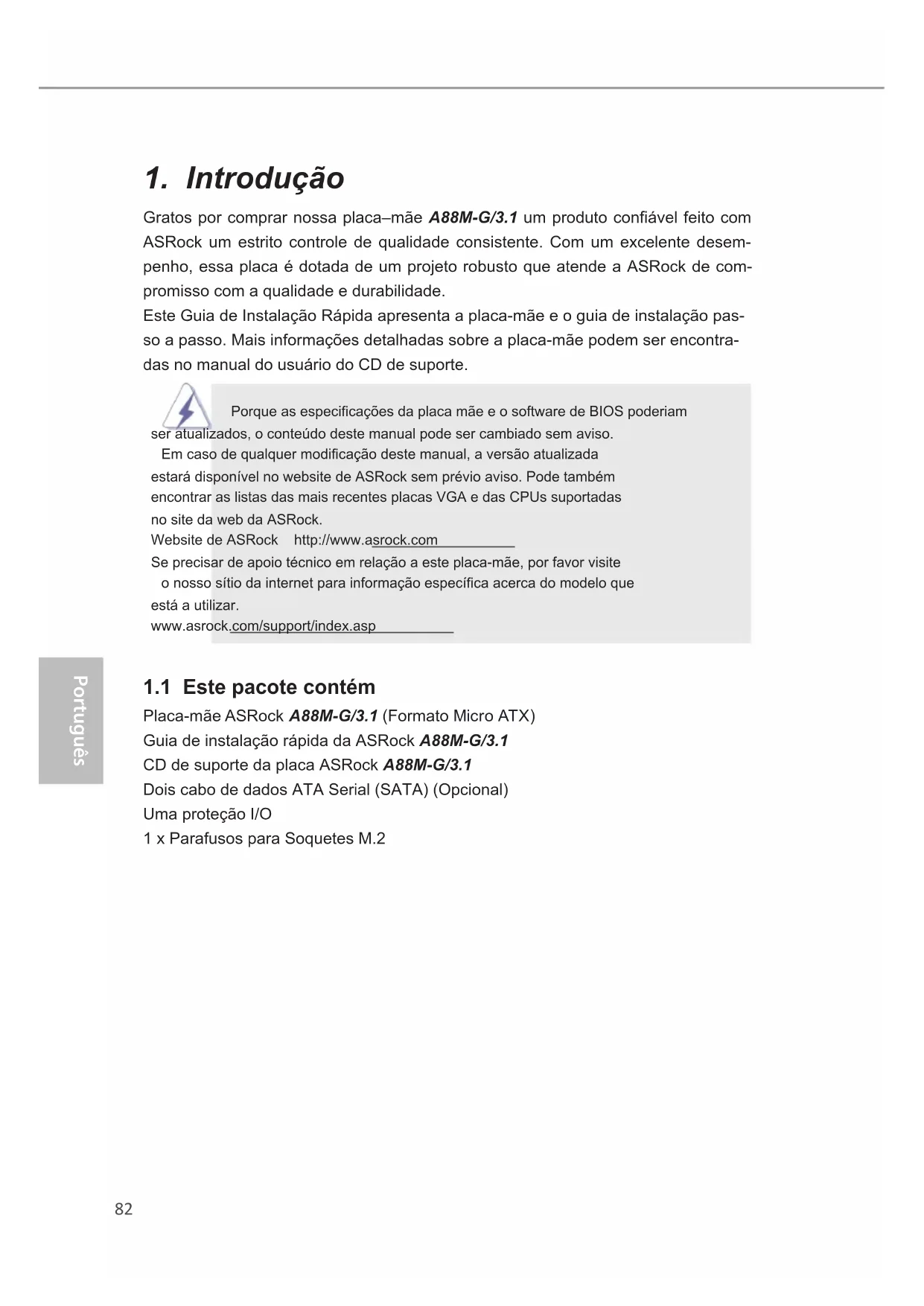 Gratos por comprar nossa placa–mãe A88M-G/3.1umprodutoconávelfeitocom ASRock um estrito controle de qualidade consistente. Com um excelente desem- penho, essa placa é dotada de um projeto robusto que atende a ASRock de com- promisso com a qualidade e durabilidade. Este Guia de Instalação Rápida apresenta a placa-mãe e o guia de instalação pas- so a passo. Mais informações detalhadas sobre a placa-mãe podem ser encontra- das no manual do usuário do CD de suporte. PorqueasespecicaçõesdaplacamãeeosoftwaredeBIOSpoderiam ser atualizados, o conteúdo deste manual pode ser cambiado sem aviso. Emcasodequalquermodicaçãodestemanual,aversãoatualizada estará disponível no website de ASRock sem prévio aviso. Pode também encontrar as listas das mais recentes placas VGA e das CPUs suportadas no site da web da ASRock. Website de ASRock http://www.asrock.com Se precisar de apoio técnico em relação a este placa-mãe, por favor visite onossosítiodainternetparainformaçãoespecícaacercadomodeloque está a utilizar. www.asrock.com/support/index.asp