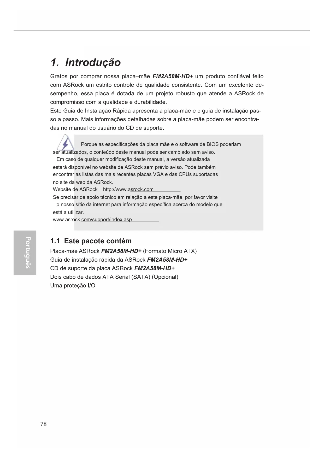 Gratos por comprar nossa placa–mãe FM2A58M-HD+umprodutoconávelfeito com ASRock um estrito controle de qualidade consistente. Com um excelente de- sempenho, essa placa é dotada de um projeto robusto que atende a ASRock de compromisso com a qualidade e durabilidade. Este Guia de Instalação Rápida apresenta a placa-mãe e o guia de instalação pas- so a passo. Mais informações detalhadas sobre a placa-mãe podem ser encontra- das no manual do usuário do CD de suporte. PorqueasespecicaçõesdaplacamãeeosoftwaredeBIOSpoderiam ser atualizados, o conteúdo deste manual pode ser cambiado sem aviso. Emcasodequalquermodicaçãodestemanual,aversãoatualizada estará disponível no website de ASRock sem prévio aviso. Pode também encontrar as listas das mais recentes placas VGA e das CPUs suportadas no site da web da ASRock. Website de ASRock http://www.asrock.com Se precisar de apoio técnico em relação a este placa-mãe, por favor visite onossosítiodainternetparainformaçãoespecícaacercadomodeloque está a utilizar. www.asrock.com/support/index.asp