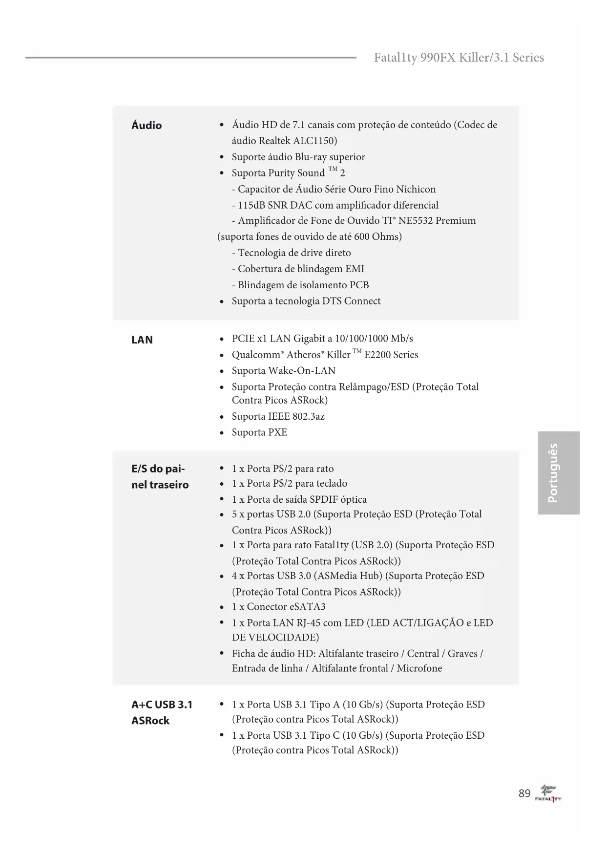 LFRAME#_LCK_33M_TPMTPM_RST#LAD3_L +3V LAD0_L+3VSBGNDF_CLKRUN#SERIRQ#S_PWRDWN# GND LAD1_LLAD2_LSMB_DATA_MAINSMB_CLK_MAIN GND87 Português Fatal1ty 990FX Killer/3.1 Series 1 Introdução Obrigado por ter comprado a placa principal ASRock Fatal1ty 990FX Killer/3.1 Series, uma placa principal ável produzida sob os rigorosos critérios de controlo de qualidade da ASRock. Esta placa principal oferece um excelente desempenho com um design robusto em conformidade com o compromisso da ASRock em fabricar produtos de qualidade e resistentes.