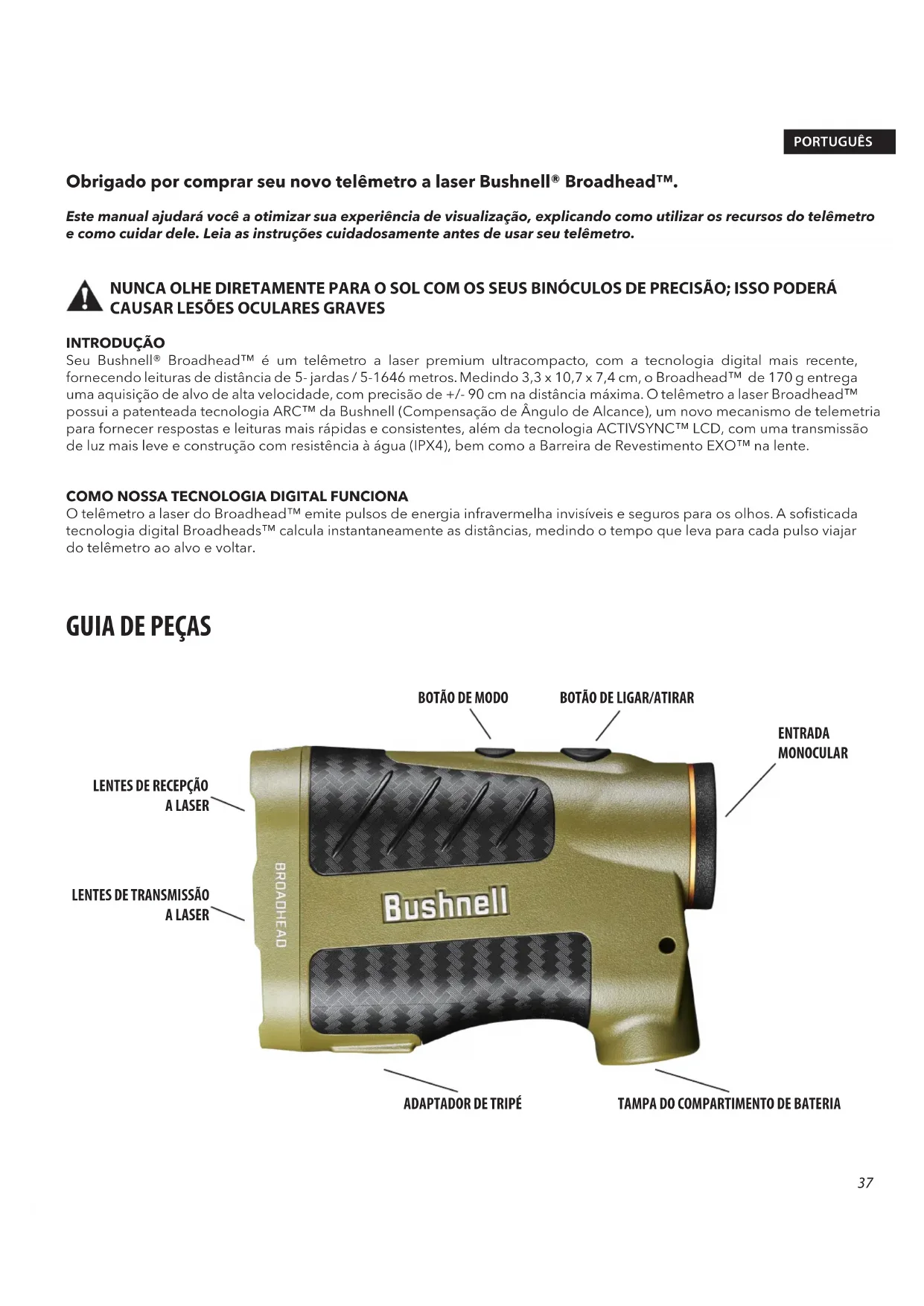 Attenzione: non ci sono controlli, regolazioni o procedure dell’utente. Prestazioni o procedure diverse da quelle qui specicate possono determinare l’accesso alla luce laser invisibile.37 Obrigado por comprar seu novo telêmetro a laser Bushnell® Broadhead™. Este manual ajudará você a otimizar sua experiência de visualização, explicando como utilizar os recursos do telêmetro e como cuidar dele. Leia as instruções cuidadosamente antes de usar seu telêmetro. NUNCA OLHE DIRETAMENTE PARA O SOL COM OS SEUS BINÓCULOS DE PRECISÃO; ISSO PODERÁ