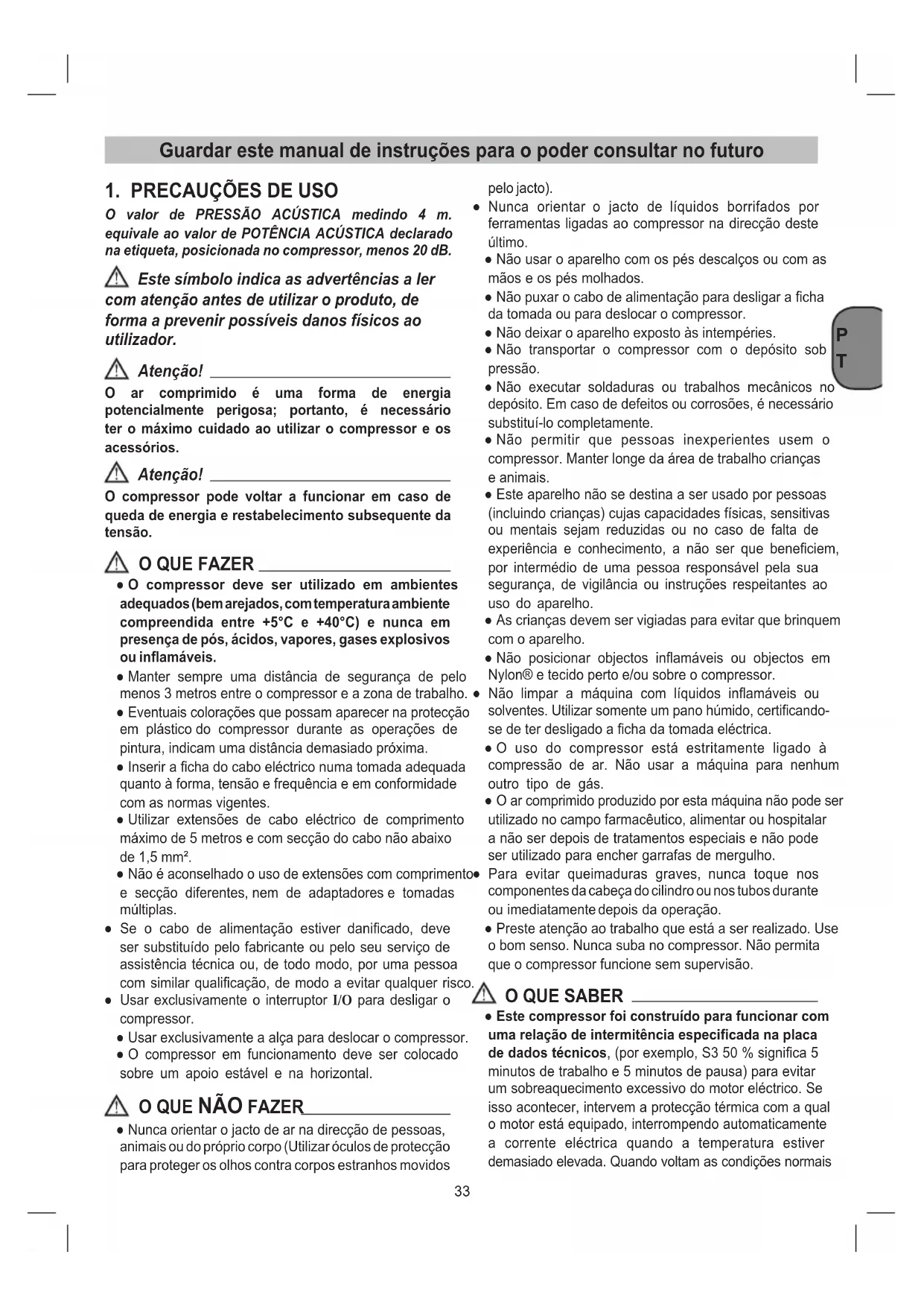 ● Este compressor foi construído para funcionar com uma relação de intermitência especicada na placa de dados técnicos, (por exemplo, S3 50 % signica 5 minutos de trabalho e 5 minutos de pausa) para evitar um sobreaquecimento excessivo do motor eléctrico. Se isso acontecer, intervem a protecção térmica com a qual o motor está equipado, interrompendo automaticamente a corrente eléctrica quando a temperatura estiver demasiado elevada. Quando voltam as condições normais Guardar este manual de instruções para o poder consultar no futuroP