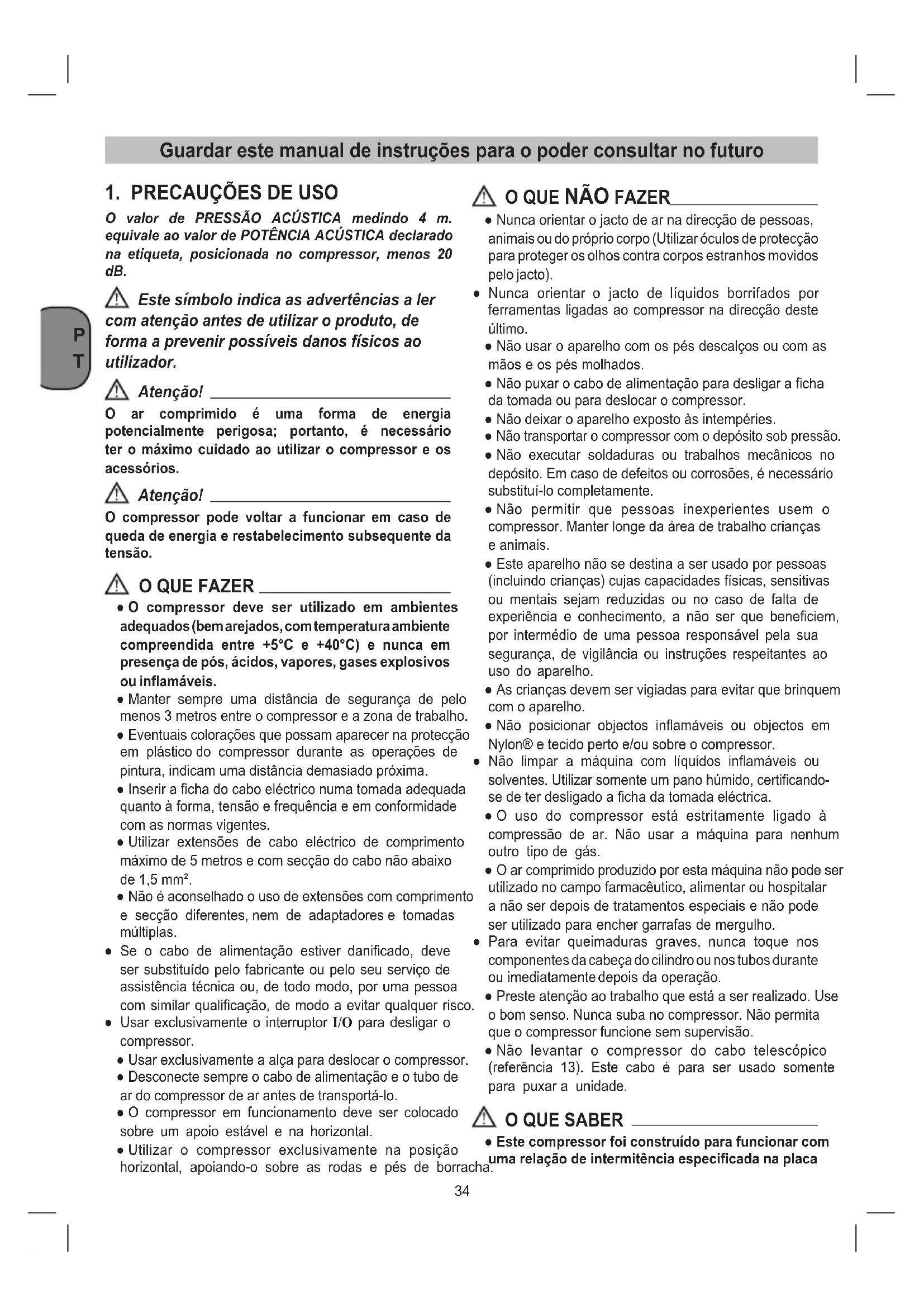 O valor de PRESSÃO ACÚSTICA medindo 4 m. equivale ao valor de POTÊNCIA ACÚSTICA declarado na etiqueta, posicionada no compressor, menos 20 dB. Este símbolo indica as advertências a ler com atenção antes de utilizar o produto, de forma a prevenir possíveis danos físicos ao utilizador. Atenção! O ar comprimido é uma forma de energia potencialmente perigosa; portanto, é necessário ter o máximo cuidado ao utilizar o compressor e os acessórios. Atenção! O compressor pode voltar a funcionar em caso de queda de energia e restabelecimento subsequente da tensão.