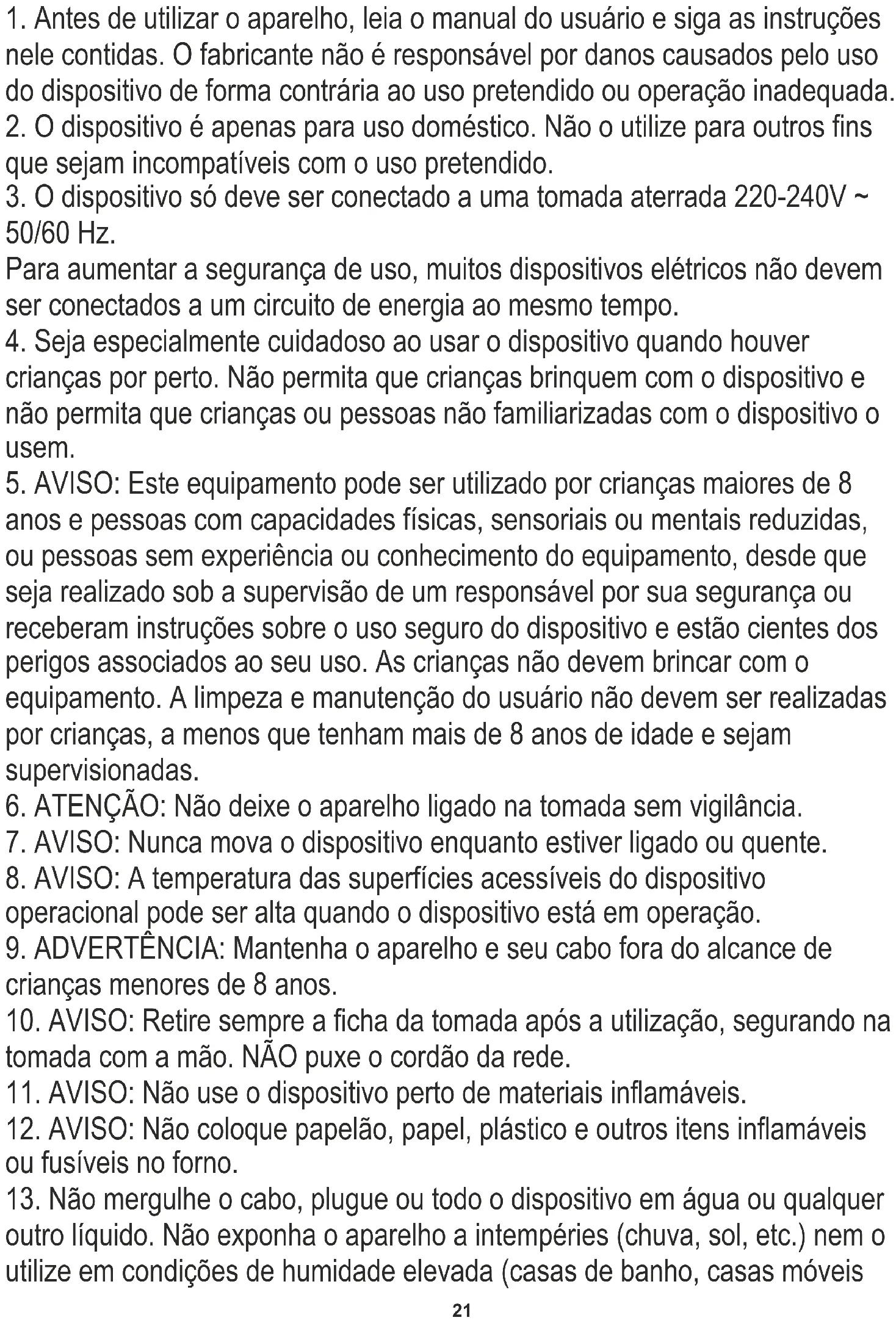 9. ADVERTÊNCIA: Mantenha o aparelho e seu cabo fora do alcance de