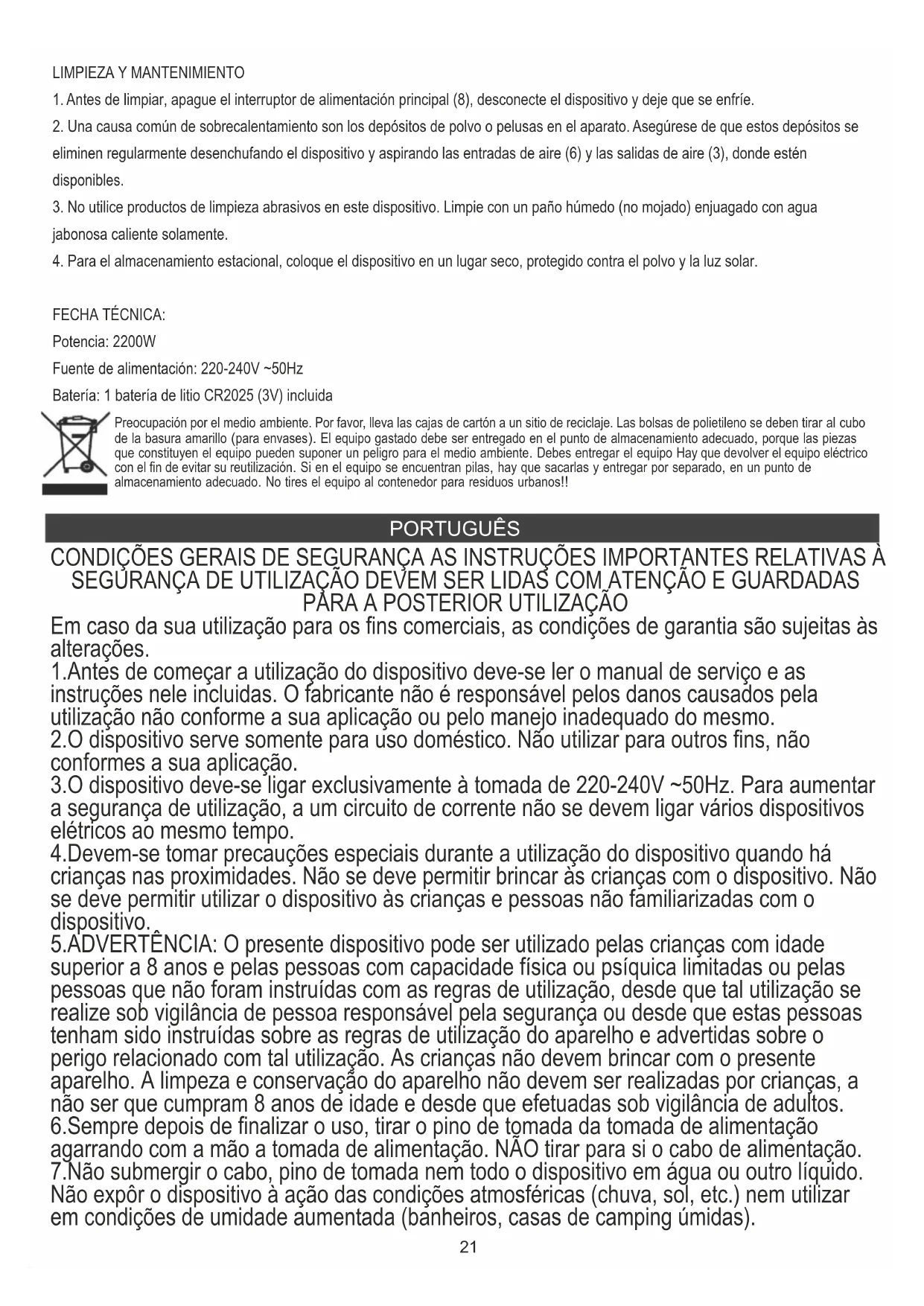 DATA TÉCNICA: Potência: 2200W Fonte de alimentação: 220-240V ~ 50Hz Bateria: 1 x bateria de lítio CR2025 (3V) incluída (LT) LIETUVIŲ Protecção do meio ambiente. Rogamos, os embalagens de cartão destinem-se para papéis velhos. Os sacos de polietileno (PE) devem-se colocar em contenedores para material plástico. O dispositivo usado deve-se levar a um ponto de armazenamento adequado porque os componentes perigosos que ficam dentro do dispositivo podem ser perigosos para o meio ambiente. O dispositivo elétrico deve-se entregar de modo que se reduza a sua nova utilização e uso. Se no dispositivo há pilhas, devem-se tirar e levar a um ponto de armazenamento em separado. Não colocar o dispositivo em contenedores para resíduos municipais!!26 kvalifikuotą elektriką.