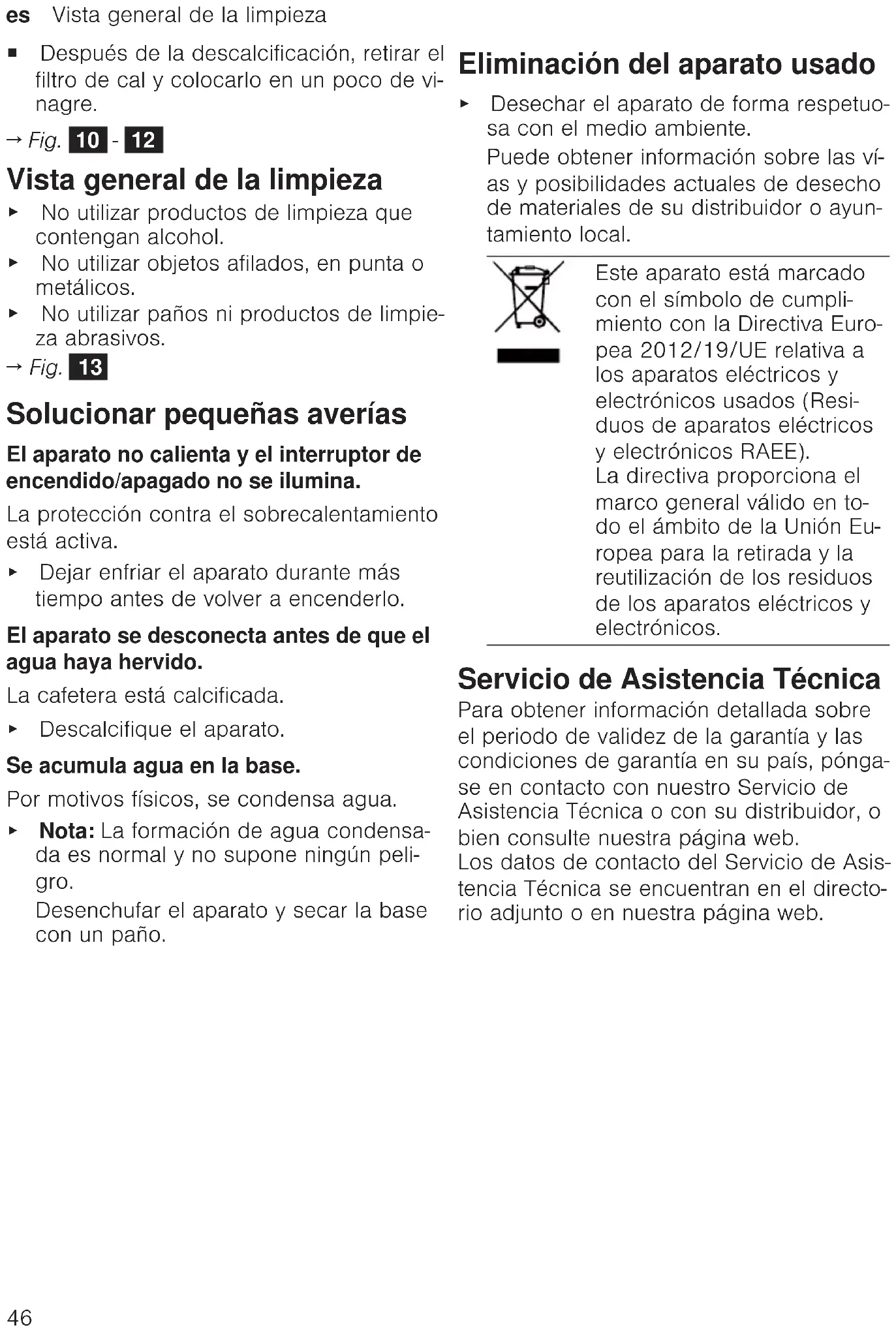 - Fig. 13 Eliminar falhas O aparelho não aquece e o interruptor para ligar/desligar não se acende. A proteção contra sobreaquecimento está ativa. ▶ Deixe o aparelho arrefecer durante bas- tante tempo antes de voltar a ligá-lo. O aparelho desliga-se antes de terminar a fervura da água. O aparelho tem calcário. ▶ Descalcifique o aparelho. A água acumula-se na base. Por motivos físicos, forma-se água de condensação. ▶ Nota:A formação de água de conden- sação é normal e segura. Retire a ficha da tomada e seque a ba- se com um pano. Eliminar o aparelho usado ▶ Elimine o aparelho de forma ecológica. Para obter mais informações sobre os procedimentos atuais de eliminação, contacte o seu Agente Especializado ou os Serviços Municipais da sua zona. Este aparelho está marcado em conformidade com a Di- rectiva 2012/19/UE relativa aos resíduos de equipamen- tos eléctricos e electrónicos (waste electrical and electro- nic equipment - WEEE). A directiva estabelece o quadro para a criação de um sistema de recolha e va- lorização dos equipamentos usados válido em todos os Estados Membros da União Europeia. Assistência Técnica Pode obter informações detalhadas sobre o período e as condições de garantia no seu país junto da nossa Assistência Técni- ca, do comerciante ou na nossa página web. Os dados de contacto da Assistência Téc- nica encontram-se no registo de pontos de Assistência Técnica em anexo ou na nossa página web.Ασφάλεια el